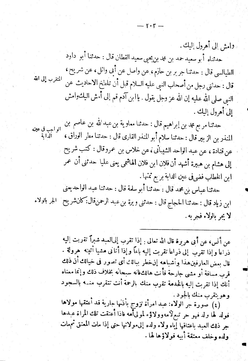 حَدَّثَنَاه أَبُو سعيد حمد بْن مُحَمَّد بْن يحيى سعيد القطان قال: حَدَّثَنَا أَبُو داود الطيالسي قال: حَدَّثَنَا جرير بْن حازم، عَن واصل عَن أبي وائل، عَن شريح، قال: حَدَّثَنِي رجل من أصحاب النَّبِيّ صَلَّى اللَّهُ عَلَيْهِ وَسَلَّمَ قبل أن تلطخ الأحاديث عَن النبي صلى الله عليه إن الله عز وجل يقول. يا ابن آدم قم إلي أمش إليك وأمش إلي أهرول إليك.