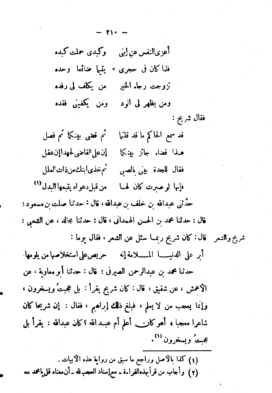 حَدَّثَنِي عَبْدُ اللهِ بْن خلف بْن عَبْد اللهِ، قال: حَدَّثَنَا صلت بْن مسعود؛ قال: حَدَّثَنَا مُحَمَّد بْن الْحَسَن الهمداني، قال: حَدَّثَنَا مجالد، عَن الشعبي؛ قال: كان شريح ربما سئل عَن الشعر، فَقَالَ: يوماً: