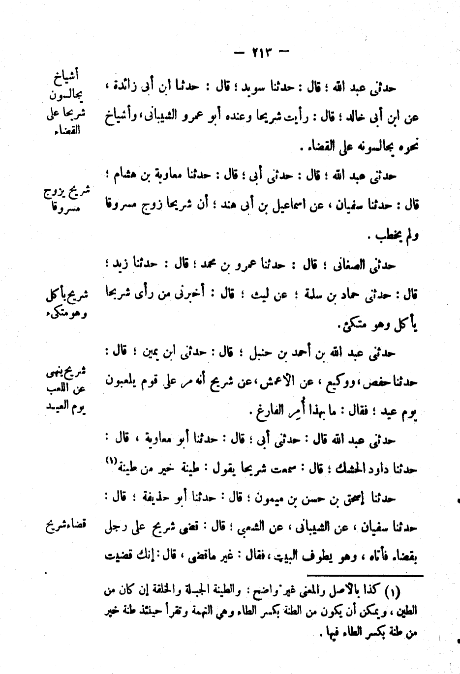 حَدَّثَنِي عَبْدُ اللهِ بْن أَحْمَد بْن حنبل؛ قال: حَدَّثَنِي ابن يمين؛ قال: حَدَّثَنَا حفص، ووكيع، عَن الأعمش، عَن شريح أنه مر على قوم يلعبون يوم عيد؛ فقال: ما بهَذَا أمر الفارغ.