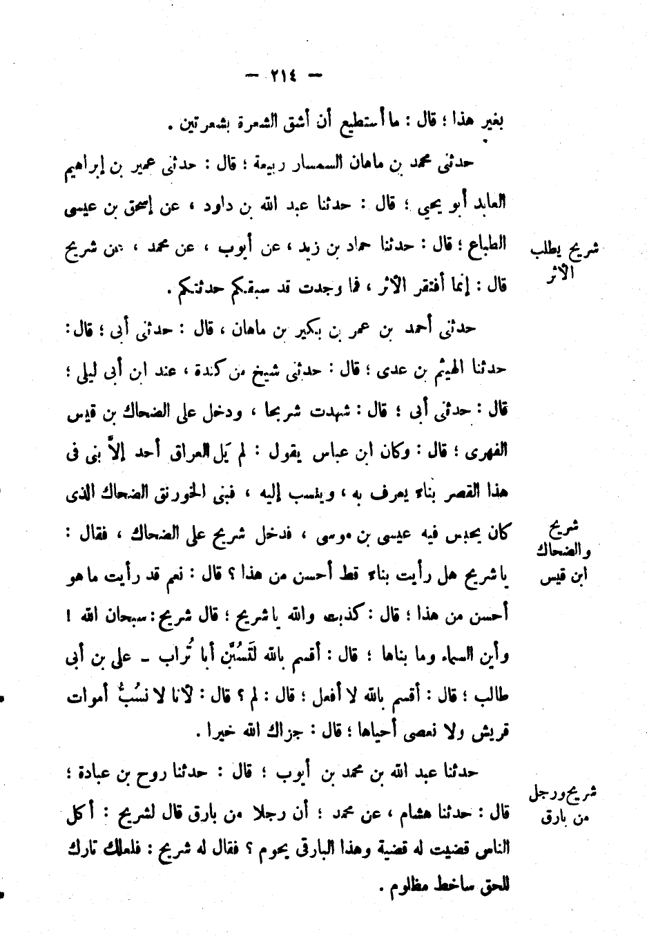 حَدَّثَنَا عَبْدُ اللهِ بْن مُحَمَّد بْن أيوب؛ قال: حَدَّثَنَا روح بْن عبادة؛ قال: حَدَّثَنَا هشام، عَن مُحَمَّد؛ أن رجلاً من بارق قَالَ: لشريح: أكل الناس قضيت له قضية وهَذَا البارقي يحوم ? فَقَالَ لَهُ شريح: فلعلك تارك للحق ساخط مظلوم.