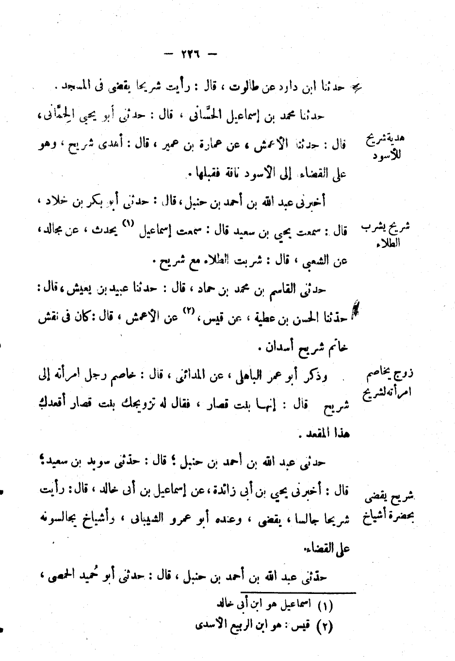 حَدَّثَنِي عَبْدُ اللهِ بْن أَحْمَد بْن حنبل؛ قال: حَدَّثَنِي سويد بْن سعيد؛ قال: أَخْبَرَنِي يحيى بْن أبي زائدة، عَن إسماعيل بْن أبي خالد، قال: رأيت شريحاً جالساً، يقضي، وعنده أَبُو عَمْرو الشيباني، وأشياخ يجالسونه على القضاء.