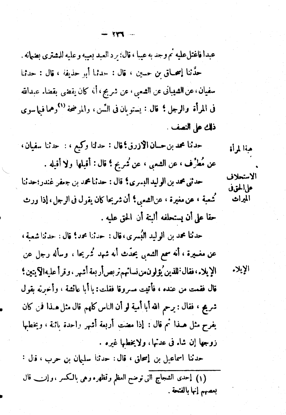 حَدَّثَنَا إسحاق بْن حسين، قال: حَدَّثَنَا أَبُو حذيفة، قال: حَدَّثَنَا سُفْيَان، عَن الشيباني عَن الشعبي، عَن شريح، أنه كان يقضي بقضاء عَبْد اللهِ في المرأة والرجل؛ قال: يستويان في السن، والموضحة وهما فيما سوى ذلك على النصف.