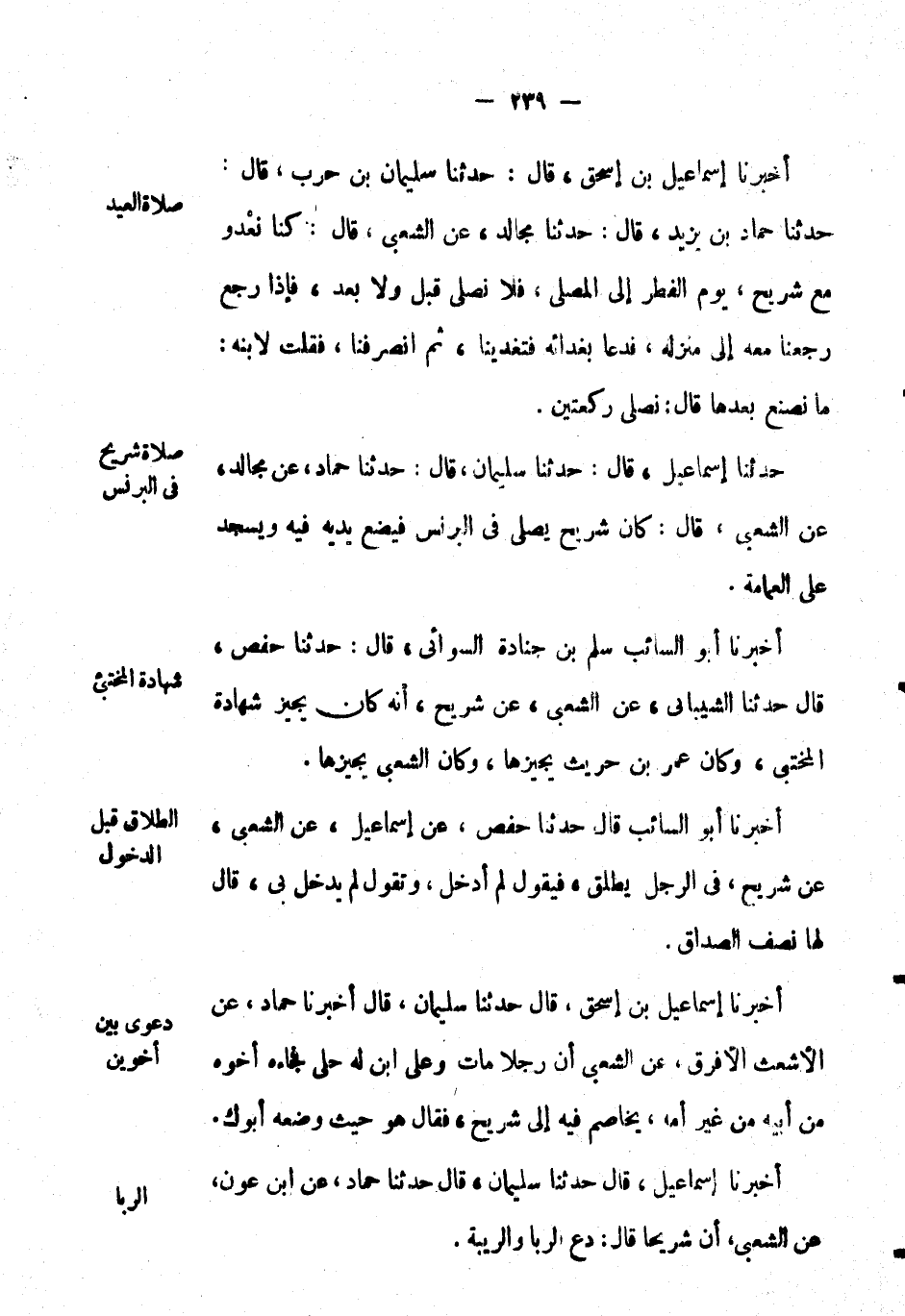 أَخْبَرَنَا إسماعيل بْن إسحاق، قال: حَدَّثَنَا سليمان بْن حرب، قال: حَدَّثَنَا حماد بْن يزيد، قال: حَدَّثَنَا مجالد، عَن الشعبي، قال: كنا نعدو مع شريح، يوم الفطر إِلَى المصلى، فلا نصلي قبل ولا بعد، فإذا رجع رجعنا معه إِلَى منزله، فدعا بغدائه فتغدينا، ثم انصرفنا، فقلت لابنه: ما نصنع بعدها قال: نصلي ركعتين.