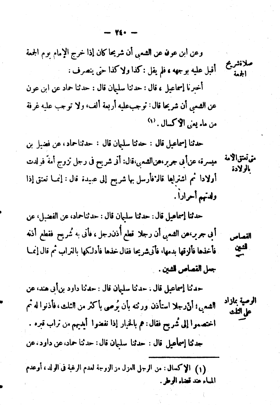 حَدَّثَنَا إسماعيل قال: حَدَّثَنَا سليمان قال: حَدَّثَنَا حماد، عَن فضيل بْن ميسرة، عَن أبي جرير، عَن الشعبي، قال: أتى شريح في رجل تزوج أمة فولدت أولاداً ثم اشتراها قَالَ: فأرسل بها شريح إِلَى عبيدة قال: إنما نعتق إِذَا ولدتهم أحراراً.