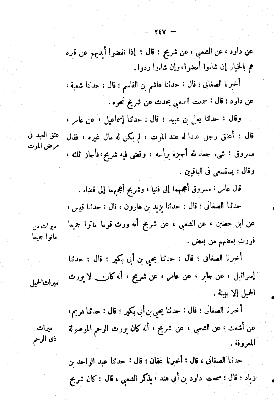 أَخْبَرَنَا الصغاني؛ قال: حَدَّثَنَا يحيى بْن أبي بكير؛ قال: حَدَّثَنَا هريم، عَن أشعث، عَن الشعبي، عَن شريح، أنه كان يورث الرحم الموصولة المعروفة.