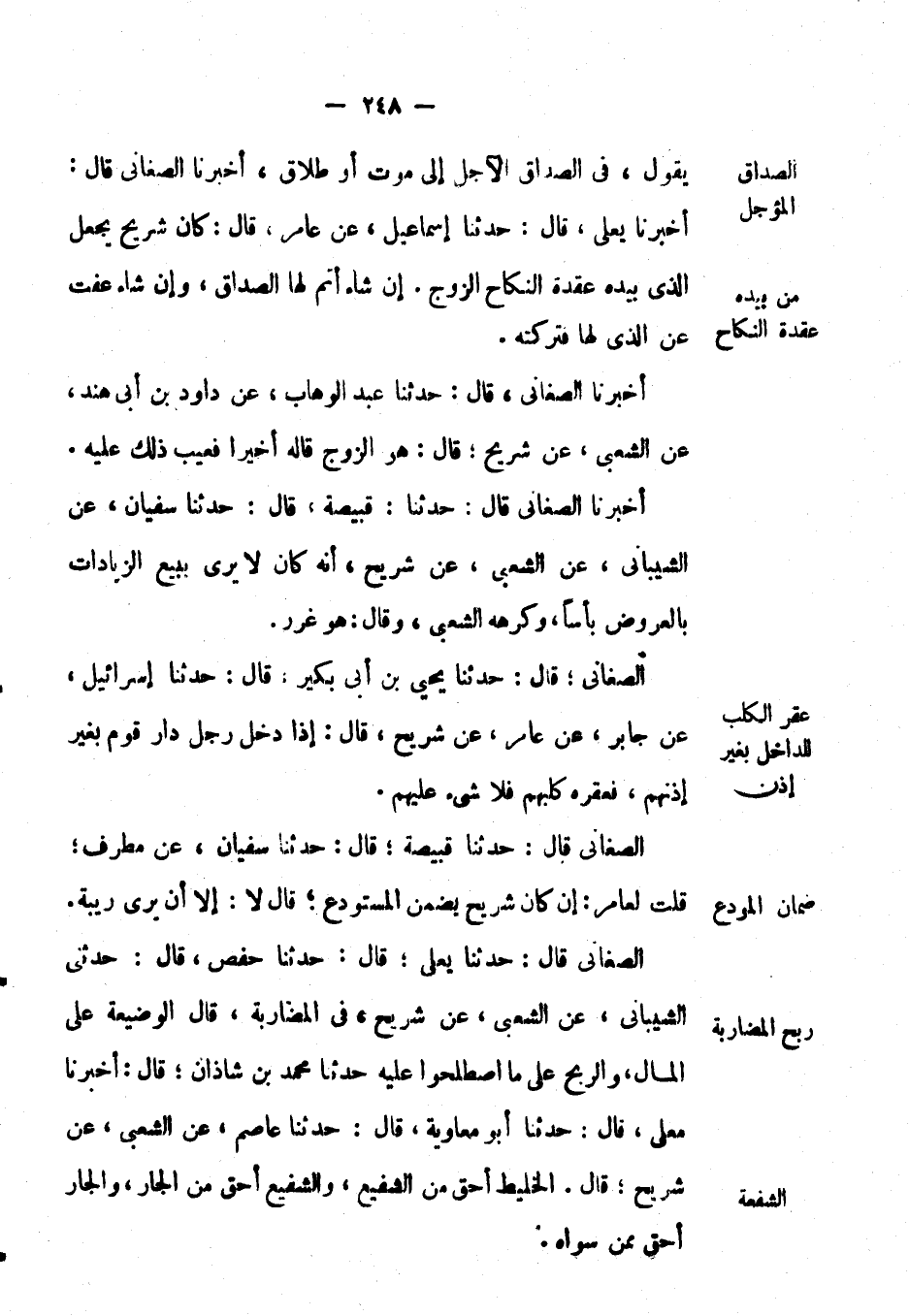 أَخْبَرَنَا الصغاني قال: أَخْبَرَنَا يعلى، قال: حَدَّثَنَا إسماعيل، عَن عامر، قال: كان شريح يجعل الذي بيده عقدة النكاح الزوج. إن شاء أتم لها الصداق، وإن شاء عفت عَن الذي لها فتركته.
