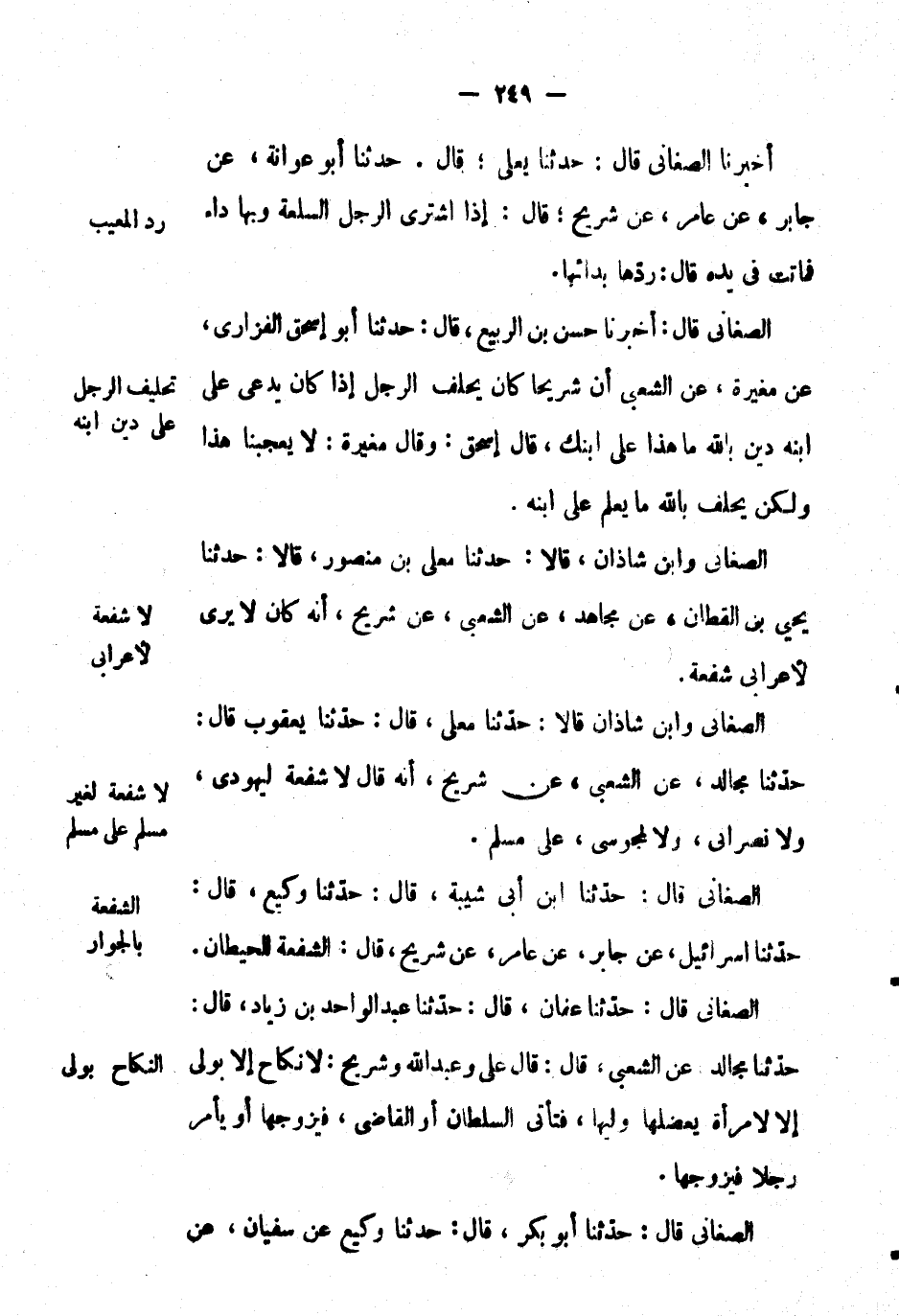 الصغاني وابن شاذان، قالا: حَدَّثَنَا معلى بْن منصور، قالا: حَدَّثَنَا يحيى بْن القطان، عَن مجاهد، عَن الشعبي، عَن شريح، أنه كان لا يرى لأعرابي شفعة.