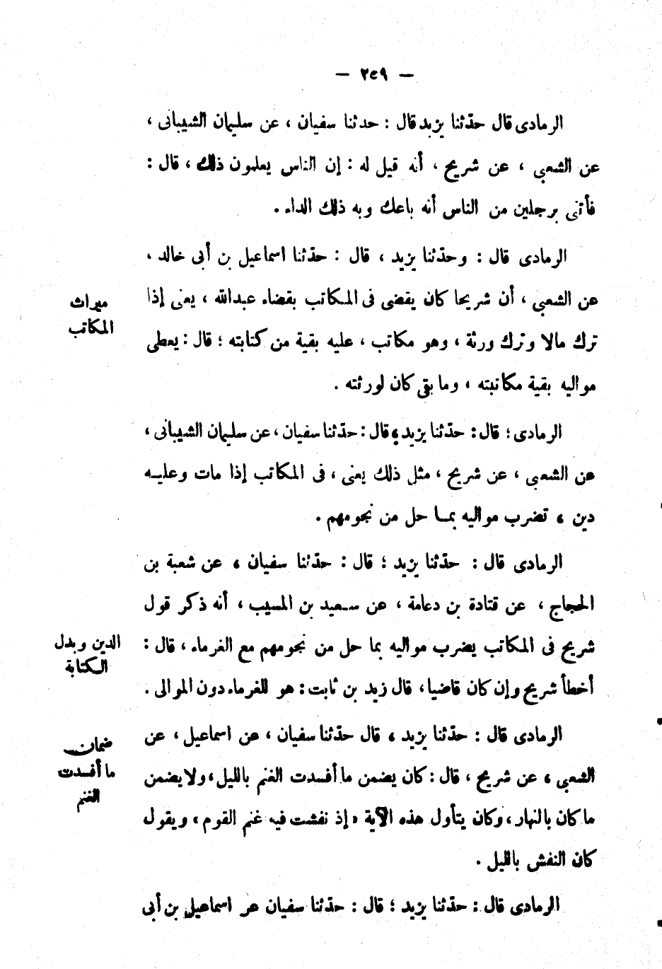 الرمادي؛ قال: حَدَّثَنَا يزيد؛ قال: حَدَّثَنَا سُفْيَان، عَن سليمان الشيباني، عَن الشعبي، عَن شريح، مثل ذلك يعني، في المكاتب إِذَا مات وعليه دين، تضرب موالي بما حل من نجومهم.