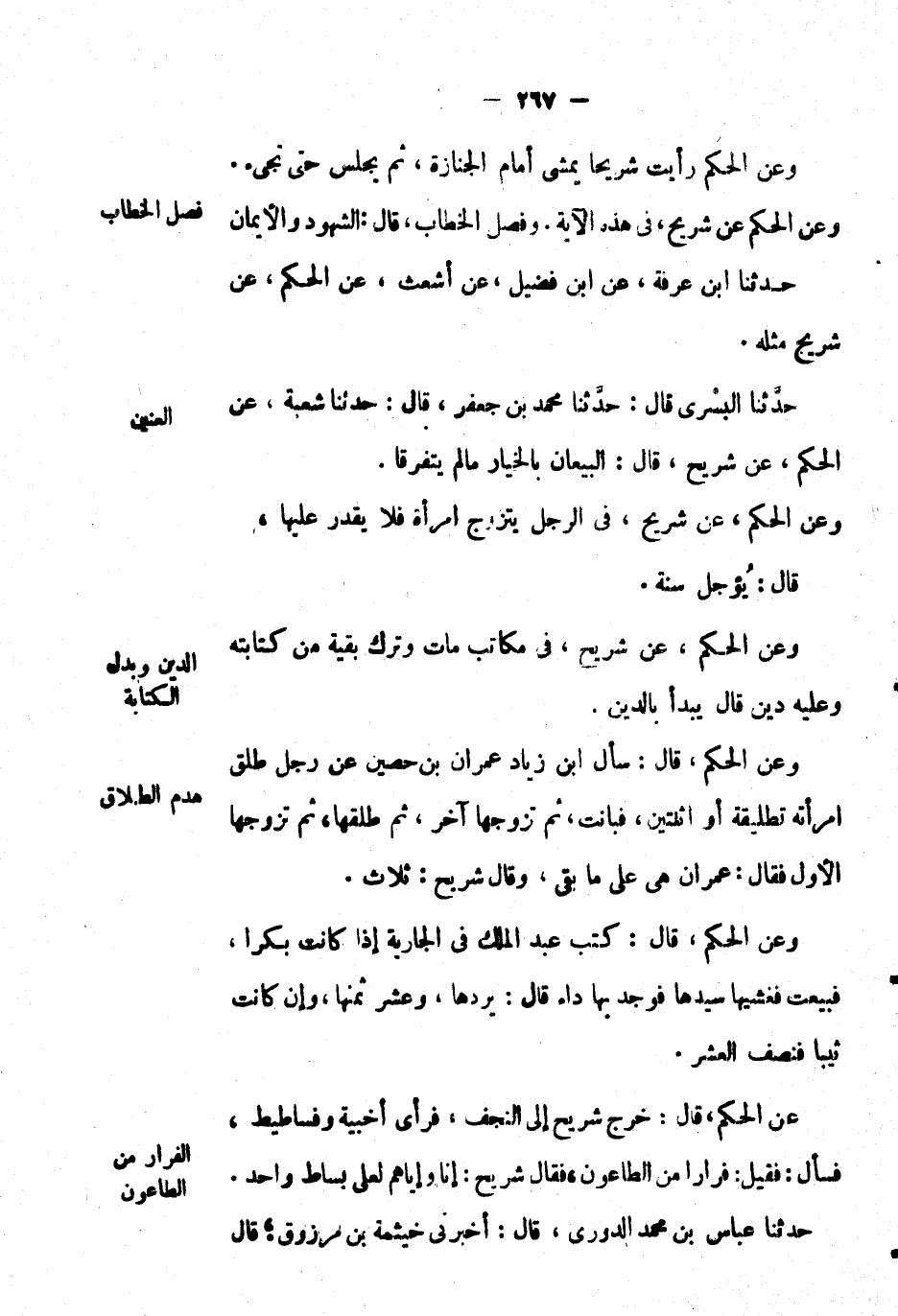 وعن الحكم، عَن شريح، في الرجل يتزوج امرأة فلا يقدر عليها، قال: يؤجل سنة. وعن الحكم، عَن شريح، في مكاتب مات وترك بقية من كتابته وعليه دين قَالَ: يبدأ بالدين.