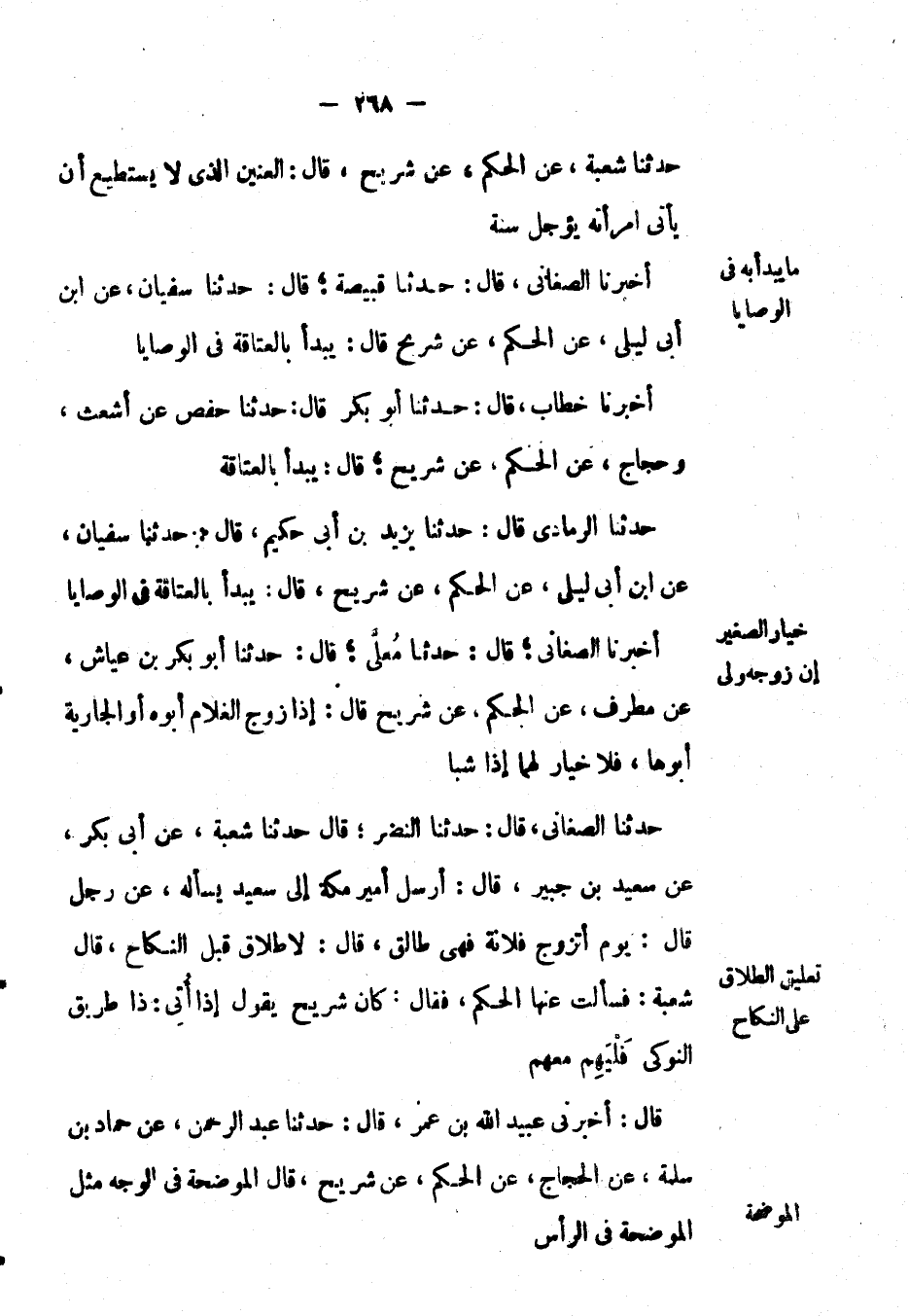 حَدَّثَنَا الصغاني، قال: حَدَّثَنَا النضر؛ قَالَ: حَدَّثَنَا شعبة، عَن أبي بكر، عَن سعيد بْن جبير، قال: أرسل أمير مكة إِلَى سعيد يسأله، عَن رجل قال: يوم أتزوج فلانة فهي طالق، قال: لا طلاق قبل النكاح، قَالَ: شعبة: فسألت عنها الحكم، فقال: كان شريح يقول إِذَا أُتِي: ذا طريق النوكى فَلْيَهِم معهم.