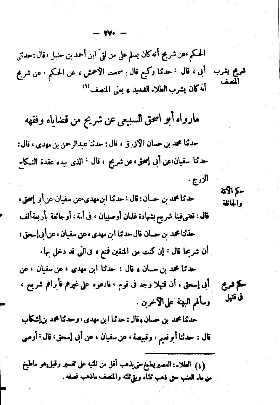 ابن أَحْمَد بْن حنبل، قال: حَدَّثَنِي أبي، قال: حَدَّثَنَا وكيع قال: سمعت الأعمش، عَن الحكم، عَن شريح أنه كان يشرب الطلاء الشديد، يعني المنصف