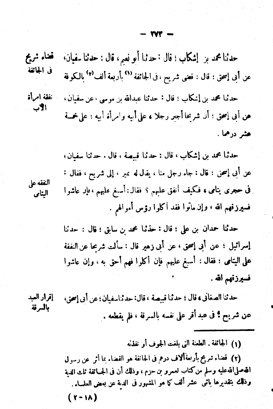 حَدَّثَنَا مُحَمَّد بْن إشكاب، قال: حَدَّثَنَا قبيصة، قال. حَدَّثَنَا سُفْيَان، عَن أبي إسحاق؛ قال: جاء رجل منا، يُقَالُ: له نمير، إِلَى شريح، فقال: في حجري يتامى، فيكف انفق عليهم ? فقال: أسغ عليهم، فإن عاشوا فسيرزقهم الله، وإن ماتوا فقد أكلوا رؤس أموالهم.