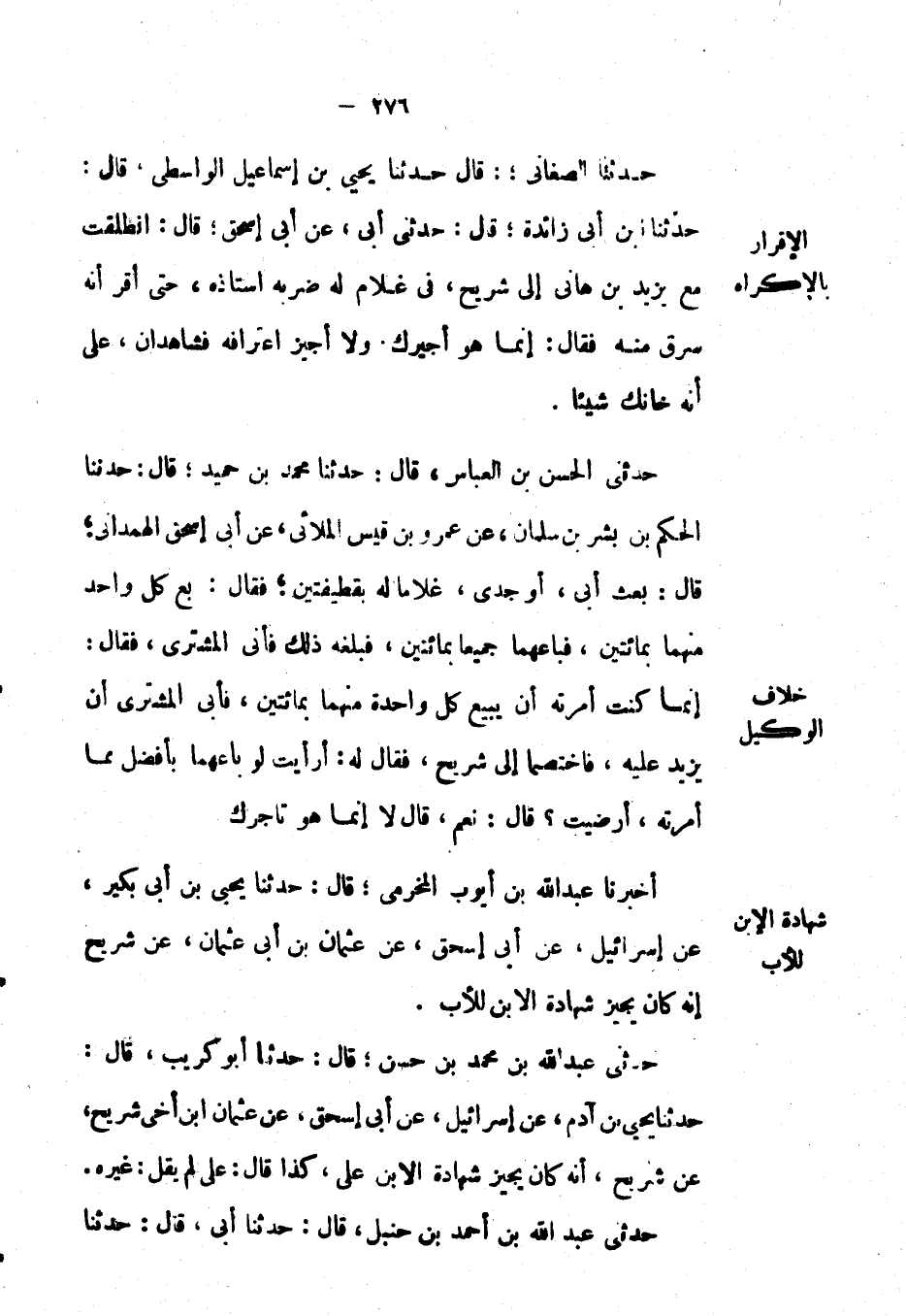حَدَّثَنَا الصغاني؛: قَالَ: حَدَّثَنَا يحيى بْن إسماعيل الواسطي، قال: حَدَّثَنَا ابن أبي زائدة؛ قال: حَدَّثَنِي أبي، عَن أبي إسحاق؛ قال: انطلقت مع يزيد بْن هاني إِلَى شريح، في غلام له ضربه استاذه، حتى أقر أنه سرق منه فقال: إنما هو أجيرك. ولا أجيز اعترافه فشاهدان، على أنه خانك شيئاً.