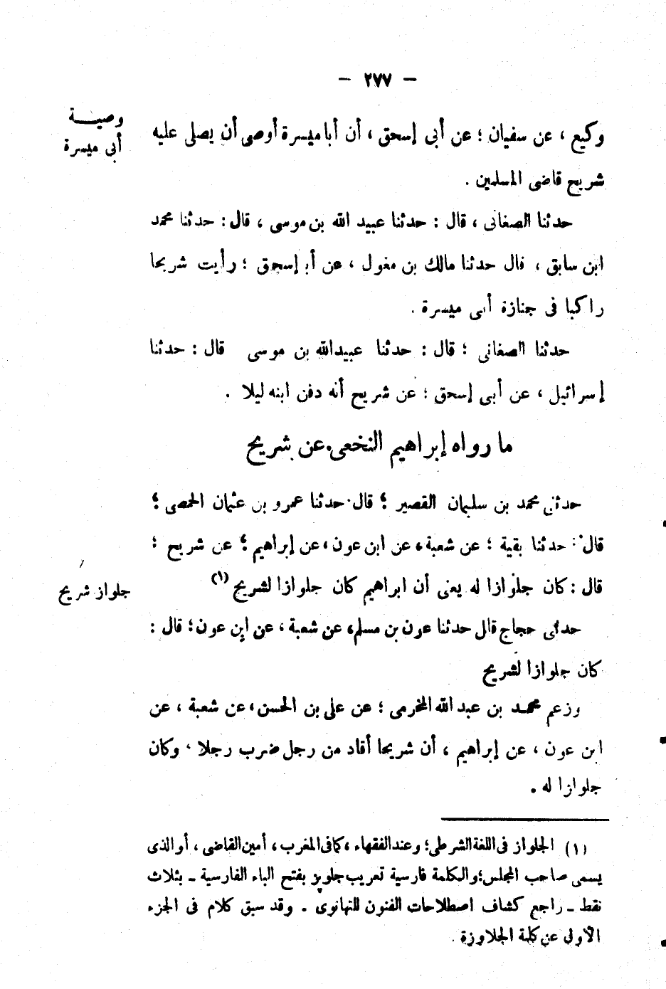 حَدَّثَنَا الصغاني، قال: حَدَّثَنَا عبيد الله بْن موسى، قال: حَدَّثَنَا مُحَمَّد ابن سابق، قَالَ: حَدَّثَنَا مالك بْن مغول، عَن أبا إسحاق؛ رأيت شريحاً راكباً في جنازة أبي ميسرة.