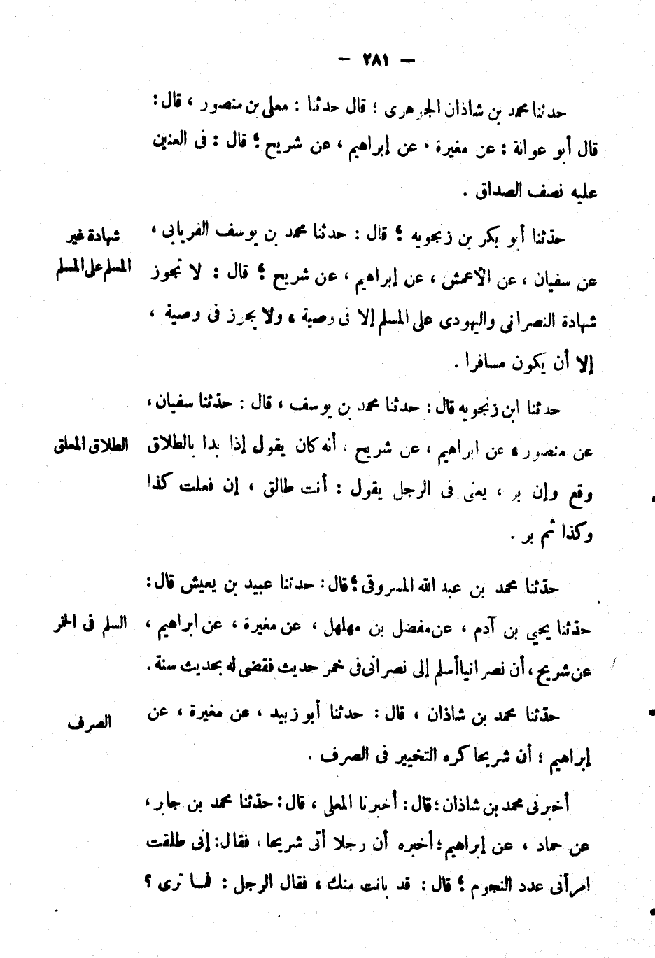 حَدَّثَنَا مُحَمَّد بْن عَبْد اللهِ المسروقي؛ قال: حَدَّثَنَا عبيد بْن يعيش قال: حَدَّثَنَا يحيى بْن آدم، عَن مفضل بْن مهلهل، عَن مغيرة، عَن إبراهيم، عَن شريح، أن نصرانياً أسلم إِلَى نصراني خمر حديث فقضى له بحديث سنة.