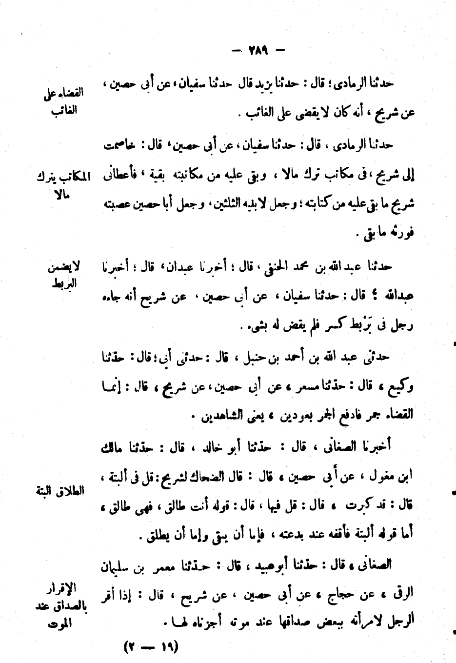 حَدَّثَنَا عَبْدُ اللهِ بْن مُحَمَّد الحنفي، قال؛ أَخْبَرَنَا عَبْدان، قال؛ أَخْبَرَنَا عَبْد اللهِ؛ قال: حَدَّثَنَا سُفْيَان، عَن أبي حصني، عَن شريح أنه جاءه رجل في بربط كسر فلم يقض له بشيء.