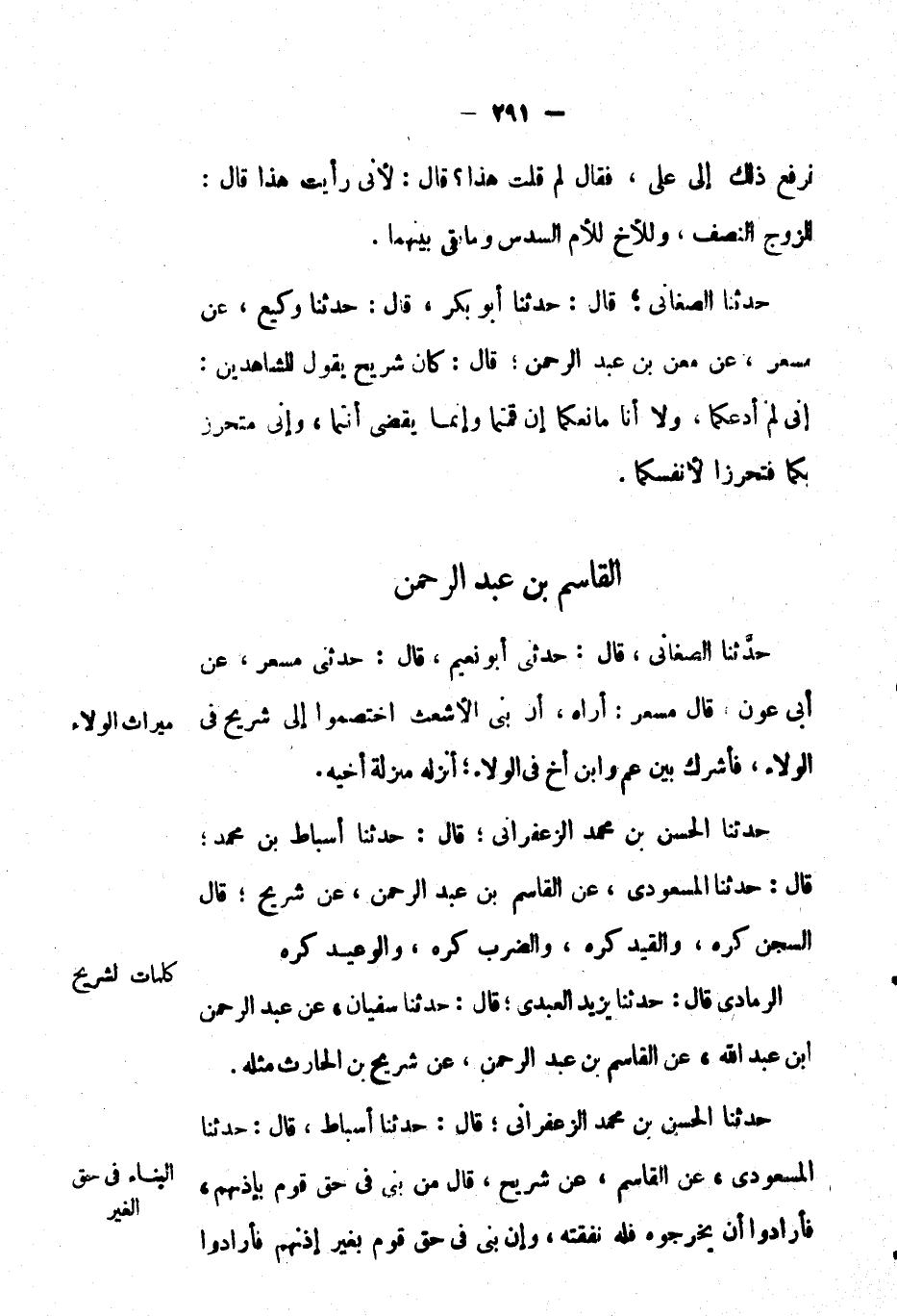 الرمادي قال: حَدَّثَنَا يزيد العَبْدي؛ قال: حَدَّثَنَا سُفْيَان، عَنْ عَبْدِ الرحمن ابن عَبْد اللهِ، عَن القاسم بْن عَبْد الرحمن، عَن شريح بْن الحارث مثله.