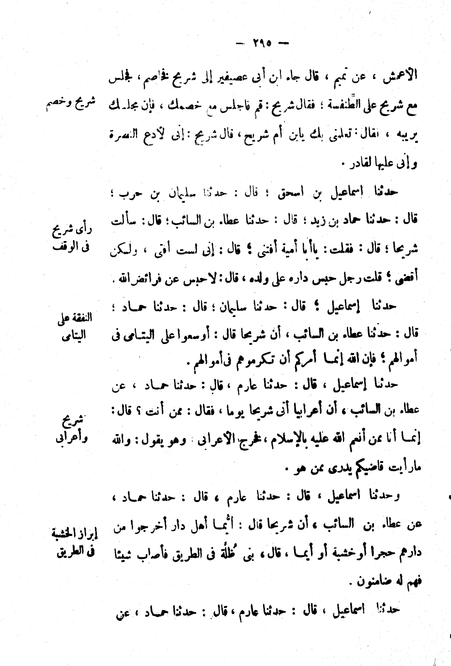 حَدَّثَنَا إسماعيل بْن إسحاق؛ قال: حَدَّثَنَا سليمان بْن حرب؛ قال: حَدَّثَنَا حماد بْن زيد؛ قال: حَدَّثَنَا عطاء بْن السائب؛ قال: سألت شريحاً؛ قال: فقلت: يا أبا أمية أفتني؛ قال: إني لست أفتي، ولكن أقضي؛ قلت رجل حبس داره على ولده، قال: لا حبس عَن فرائض الله.