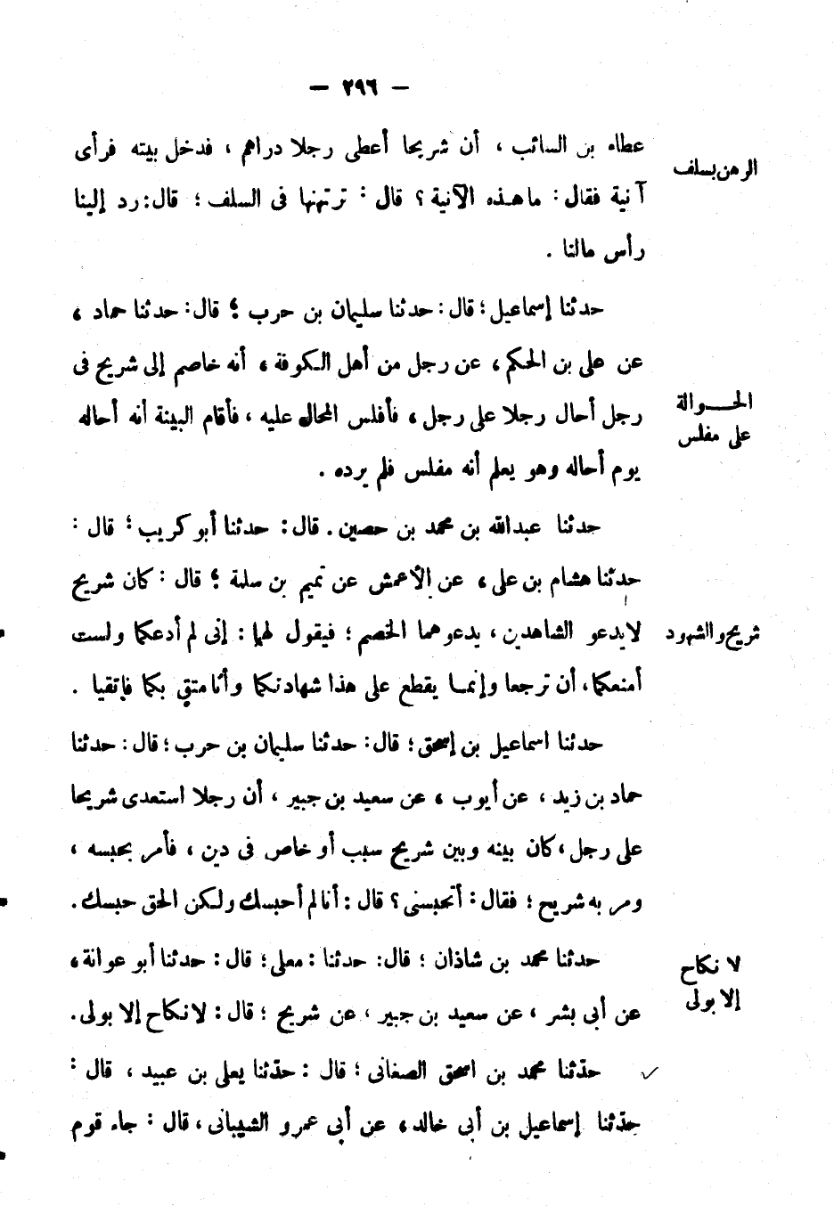 حَدَّثَنَا مُحَمَّد بْن شاذان؛ قال: حَدَّثَنَا: معلى؛ قال: حَدَّثَنَا أَبُو عوانة، عَن أبي بشر، عَن سعيد بْن جبير، عَن شريح؛ قال: لا نكاح إِلَّا بولي.