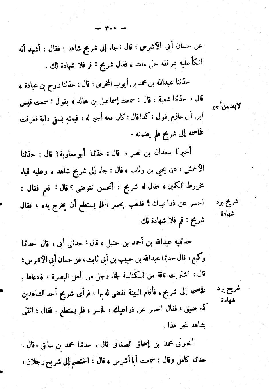 حَدَّثَنِيه عَبْد اللهِ بْن أَحْمَد بْن حنبل، قال: حَدَّثَنِي أبي، قَالَ: حَدَّثَنَا وكيع، قَالَ: حَدَّثَنَا عَبْدُ اللهِ بْن حبيب بْن أبي ثابت، عَن حسان أبي الأشرس؛ قال: اشتريت ناقة من الكناسة فجاء رجل من أهل البصرة، فادعاها. فخاصمه إِلَى شريح، فأقام البينة فقضى له بها، فرأى شريح أحد الشاهدين كمه ضيق، فَقَالَ: احسر عَن ذراعيك، فحسر، فلم يستطع، فقال؛ ائتني بشاهد غير هَذَا.