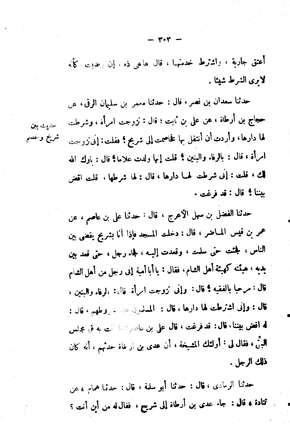 حَدَّثَنَا الفضل بْن سهل الأعرج، قال: حَدَّثَنَا علي بْن عاصم، عَن عُمَر بْن قيس الماضر، قال: دخلت المسجد فإذا أنا بشريح يقضي بي الناس، فجئت حتى سلمت، وقعدت إليه، فجاء رجل، حتى قعد بين يديه، هيئته كهيئة أهل الشام، فقال: يا أبا أمية إني رجل من أهل الشام قال: مرحباً بالفقيه؛ قال: وإني تزوجت امرأة قال: بالرفاء والبنين، قال: وإني اشترطت لها دارها، قال: المسلمون عند شروطهم، قال: له اقض بيننا، قال: قد فرغت، قَالَ: علي بْن عاصم: فحدثت به في مجلس البتي، فَقَالَ لي: أولئك المشيخة، أن عدي بْن أرطاة حدثهم، أنه كان ذلك الرجل.