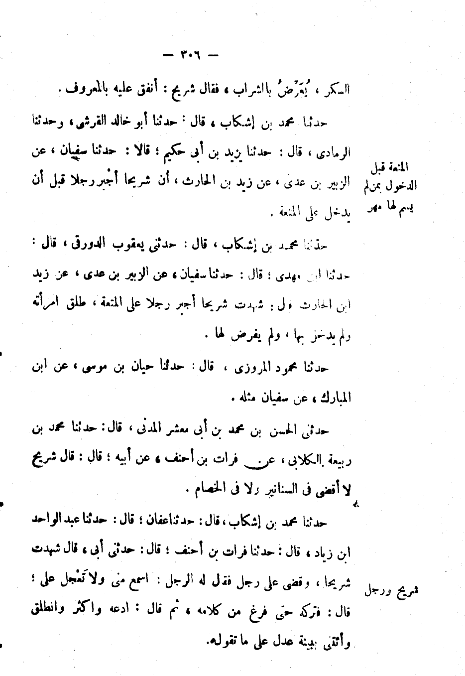 حَدَّثَنَا مُحَمَّد بْن إشكاب، قال: حَدَّثَنِي يعقوب الدورقي، قال: حَدَّثَنَا ابن مهدي؛ قال: حَدَّثَنَا سُفْيَان، عَن الزبير بْن عدي، عَن زيد ابن الحارث قال: شهدت شريحاً أجبر رجلاً على المتعة، طلق امرأته ولم يدخل بها، ولم يفرض لها.