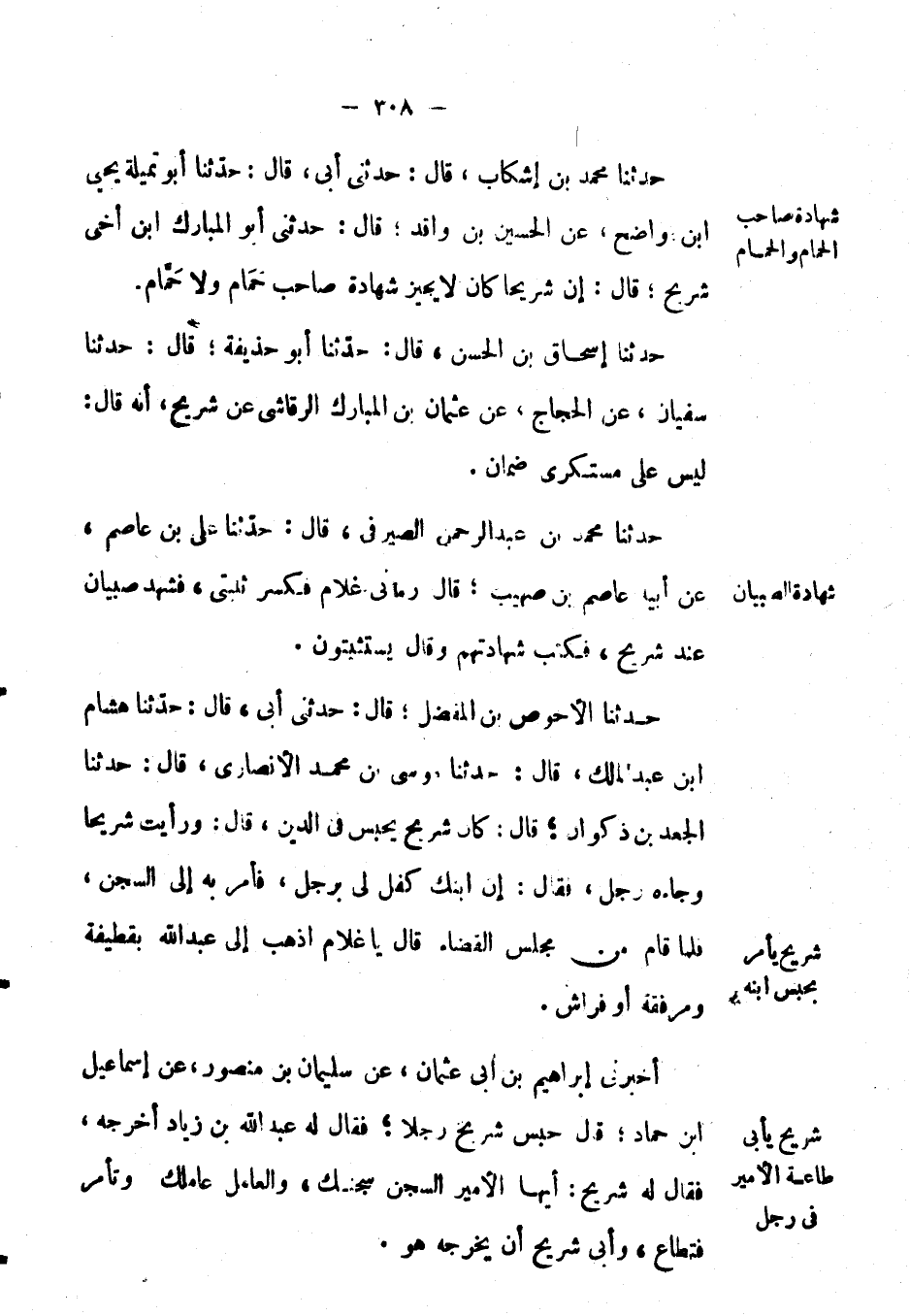 حَدَّثَنَا مُحَمَّد بْن إشكاب، قال: حَدَّثَنِي أبي، قال: حَدَّثَنَا أَبُو تميلة يحيى ابن واضح، عَن الحسين بْن واقد؛ قال: حَدَّثَنِي أَبُو المبارك ابن أخي شريح؛ قال: إن شريحاً كان لا يجيز شهادة صاحب حَمَام ولا حَمَّامٍ.