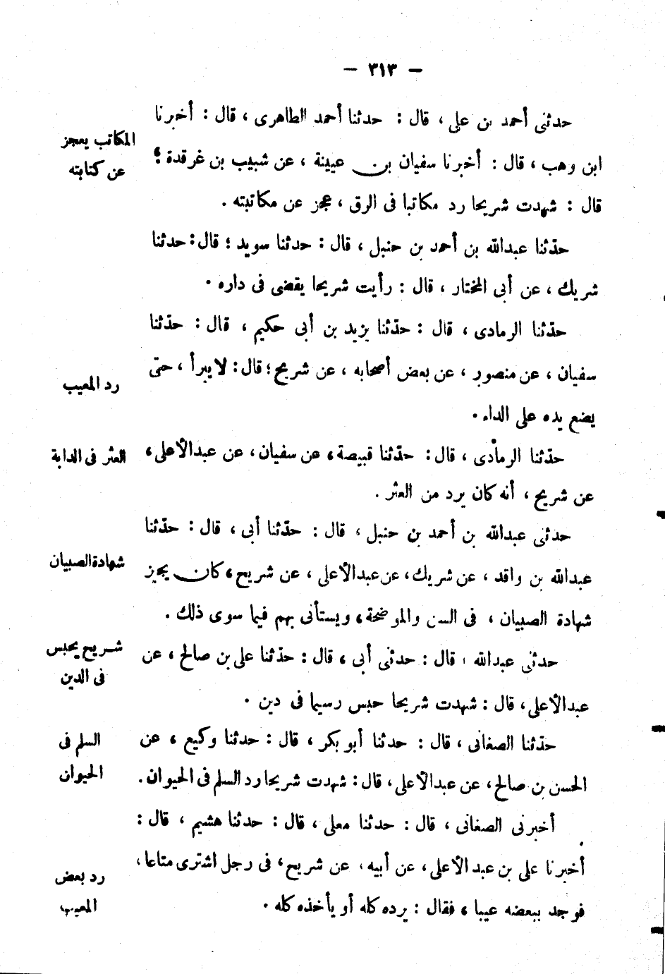 حَدَّثَنِي أَحْمَد بْن علي، قال: حَدَّثَنَا أَحْمَد الطاهري، قال: أَخْبَرَنَا ابن وهب، قال: أَخْبَرَنَا سُفْيَان بْن عيينة، عَن شبيب بْن غرقدة؛ قال: شهدت شريحاً رد مكاتباً في الرق، عجز عَن مكاتبته.