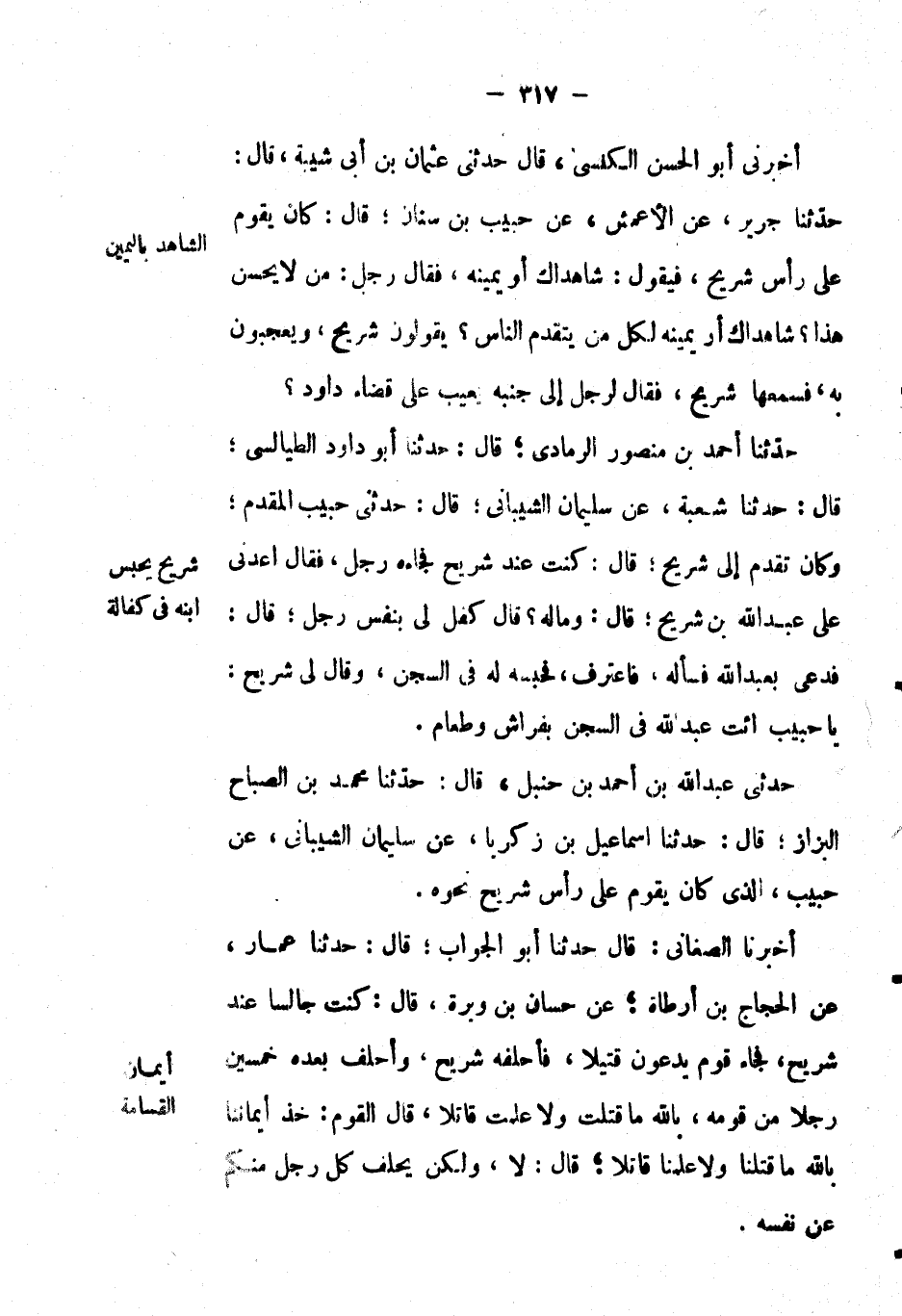 حَدَّثَنَا أَحْمَد بْن منصور الرمادي؛ قال: حَدَّثَنَا أَبُو داود الطيالسي؛ قال: حَدَّثَنَا شعبة، عَن سليمان الشيباني؛ قال: حَدَّثَنِي حبيب المقدم؛ وكان تقدم إِلَى شريح؛ قال: كنت عند شريح فجاءه رجل، فَقَالَ: اعدني على عَبْد اللهِ بْن شريح؛ قال: وماله ? قَالَ: كفل لي بنفس رجل؛ قال: فدعى بعَبْد اللهِ فسأله، فاعترف، فحبسه له في السجن، وقَالَ لي: شريح: يا حبيب ائت عَبْد اللهِ في السجن بفراش وطعام.