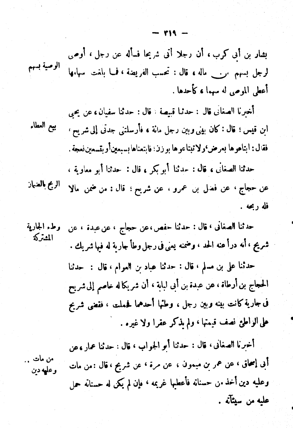 حَدَّثَنَا الصغاني، قال: حَدَّثَنَا أَبُو بكر، قال: حَدَّثَنَا أَبُو معاوية، عَن حجاج، عَن فضل بْن عَمْرو، عَن شريح؛ قال: من ضمن مالاً فله ربحه.