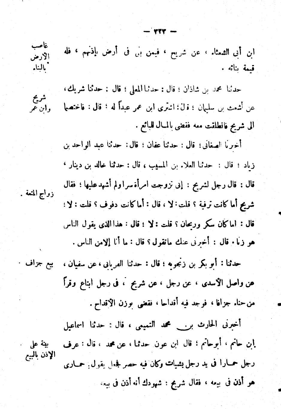 أَخْبَرَنَا الصغاني؛ قال: حدثن عفان؛ قال: حَدَّثَنَا عَبْدُ الواحد بْن زياد؛ قال: حَدَّثَنَا العلاء بْن المسيب، قال: حَدَّثَنَا خالد بْن دينار، قال: قَالَ: رجل لشريح: إني تزوجت امرأة سراً ولم أشهد عليها؛ فَقَالَ: شريح: أما كانت ترفية، قلت: لا، قال: أما كانت دفوف ? قلت: لا؛ قال: أما كان سكر وريحان ? قلت: لا؛ قال: هَذَا الذي يقول الناس هو زنا. قال: أَخْبَرَنِي عنك ما تقول ? قال: ما أنا إِلَّا من الناس.