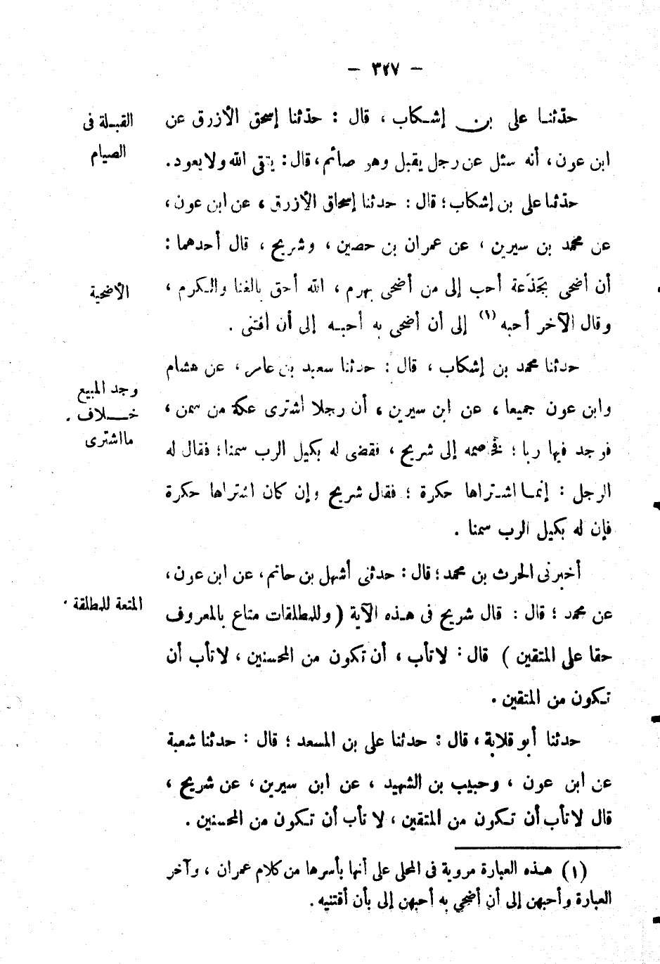 حَدَّثَنَا علي بْن إشكاب؛ قال: حَدَّثَنَا إسحاق الأزرق، عَن ابن عون، عَن مُحَمَّد بْن سيرين، عَن عِمْرَان بْن حصين، وشريح، قَالَ: أحدهما: أن أضحى بجذعة أحب إلى من أضحى بهرم، الله أحق بالغنا والكرم، وقَالَ: الآخر: أحبه إلى أن أضحى به أحبه إلى أن أقتنى.