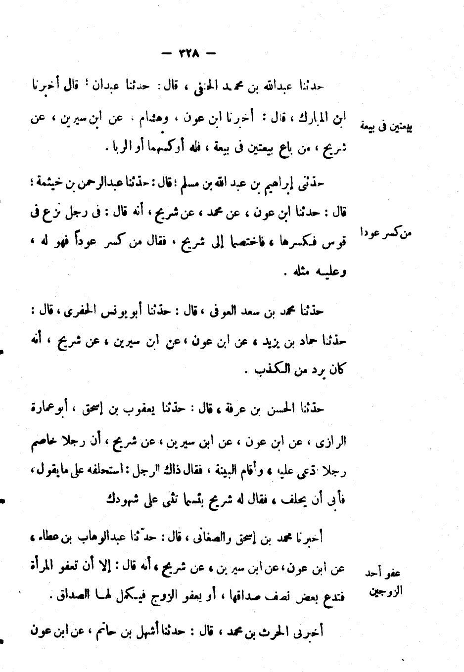 حَدَّثَنَا عَبْدُ اللهِ بْن مُحَمَّد الحنفي، قال: حَدَّثَنَا عَبْدَان؛ قَالَ: أَخْبَرَنَا ابن المبارك، قال: أَخْبَرَنَا ابن عون، وهشام. عَن ابن سيرين، عَن شريح، من باع بيعتين في بيعة، فله أوكسهما أو الربا.