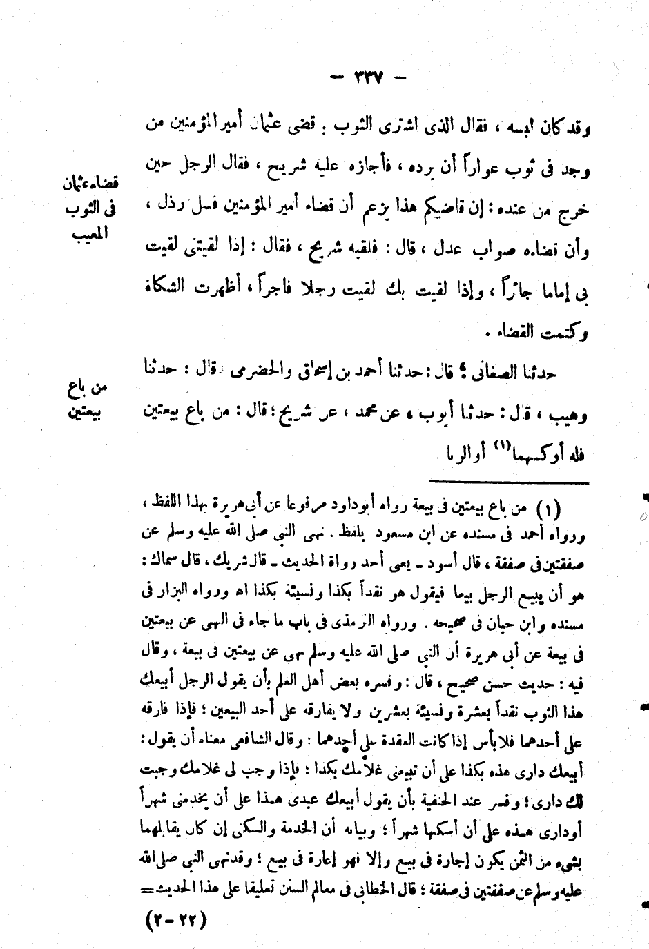 حَدَّثَنَا الصغاني؛ قال: حَدَّثَنَا أَحْمَد بْن إسحاق والحضرمي، قال: حَدَّثَنَا وهيب، قال: حَدَّثَنَا أيوب، عَن مُحَمَّد، عَن شريح؛ قال: من باع بيعتين فله أوكسهما أو الربا.