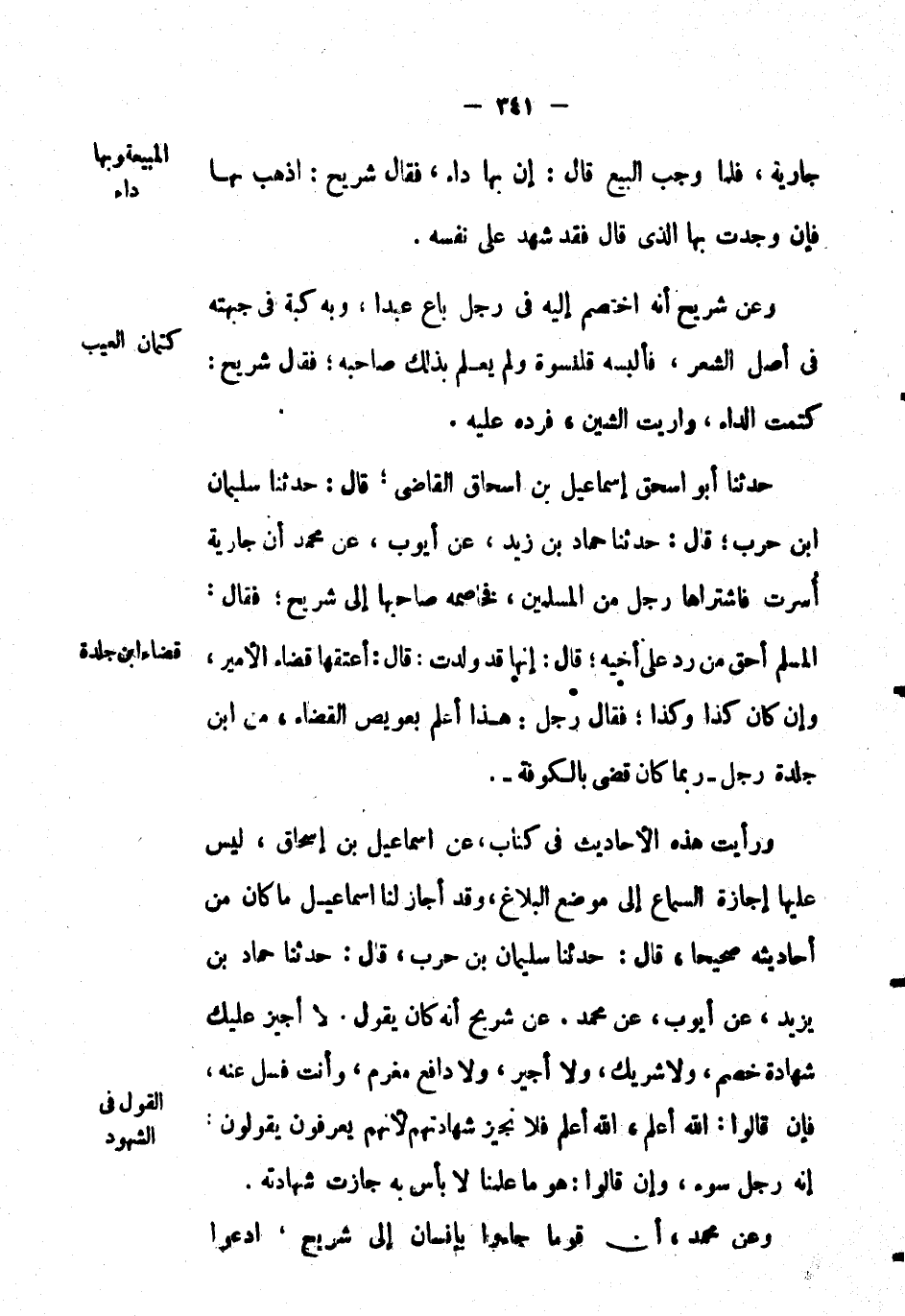 حَدَّثَنَا أَبُو اسحق إسماعيل بْن إسحاق القاضي؛ قال: حَدَّثَنَا سليمان ابن حرب؛ قال: حَدَّثَنَا حماد بْن زيد، عَن أيوب، عَن مُحَمَّد أن جارية أسرت فاشتراها رجل من المسلمين، فخاصمه صاحبها إِلَى شريح؛ فقال: المسلم أحق من رد على أخيه؛ قال: إنها قد ولدت: قال: أعتقها قضاء الأمير، وإن كان كذا وكذا؛ فَقَالَ: رجل: هَذَا أعلم بعويص القضاء، من ابن جلدة رجل ربما كان قضى بالكوفة.