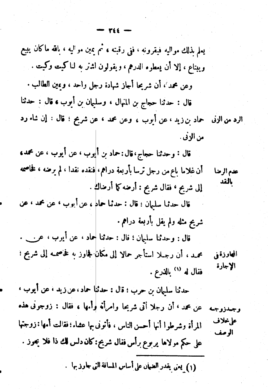 قال: وَحَدَّثَنَا سليمان؛ قال: حَدَّثَنَا حماد، عَن أيوب، عَن مُحَمَّد، أن رجلاً استأجر حمالاً إِلَى مكان فجاوز به فخاصمه إِلَى شريح؛ فَقَالَ لَهُ بالذرع.