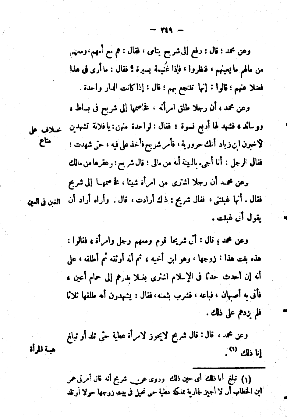 وعن مُحَمَّد، أن رجلاً طلق امرأته، فخاصمها إِلَى شريح في بساط، ووسائد، فشهد لها أربع نسوة؛ فقال لواحدة منهن: يا فلانة تشهدين لأخبرن ابن زِيَاد أنك حرورية، فأمر شريح فأخذ على فيه، حتى شهدت؛ فَقَالَ: الرجل: أنا أجيء بالبينة أنه من مالي؛ قَالَ: شريح: وعقرها من مالك.