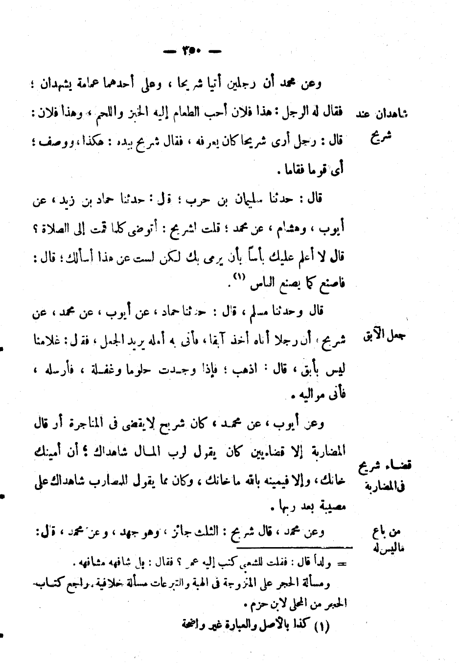 وعن أيوب، عَن مُحَمَّد، كان شريح لا يقضي في المناجرة أو قَالَ: المضاربة إِلَّا قضاءيين كان يقول لرب المال شاهداك؛ أن أمينك خانك، وإلا فيمينه بالله ما خانك، وكان مما يقول للمضارب شاهداك على مصيبة بعد ربها.