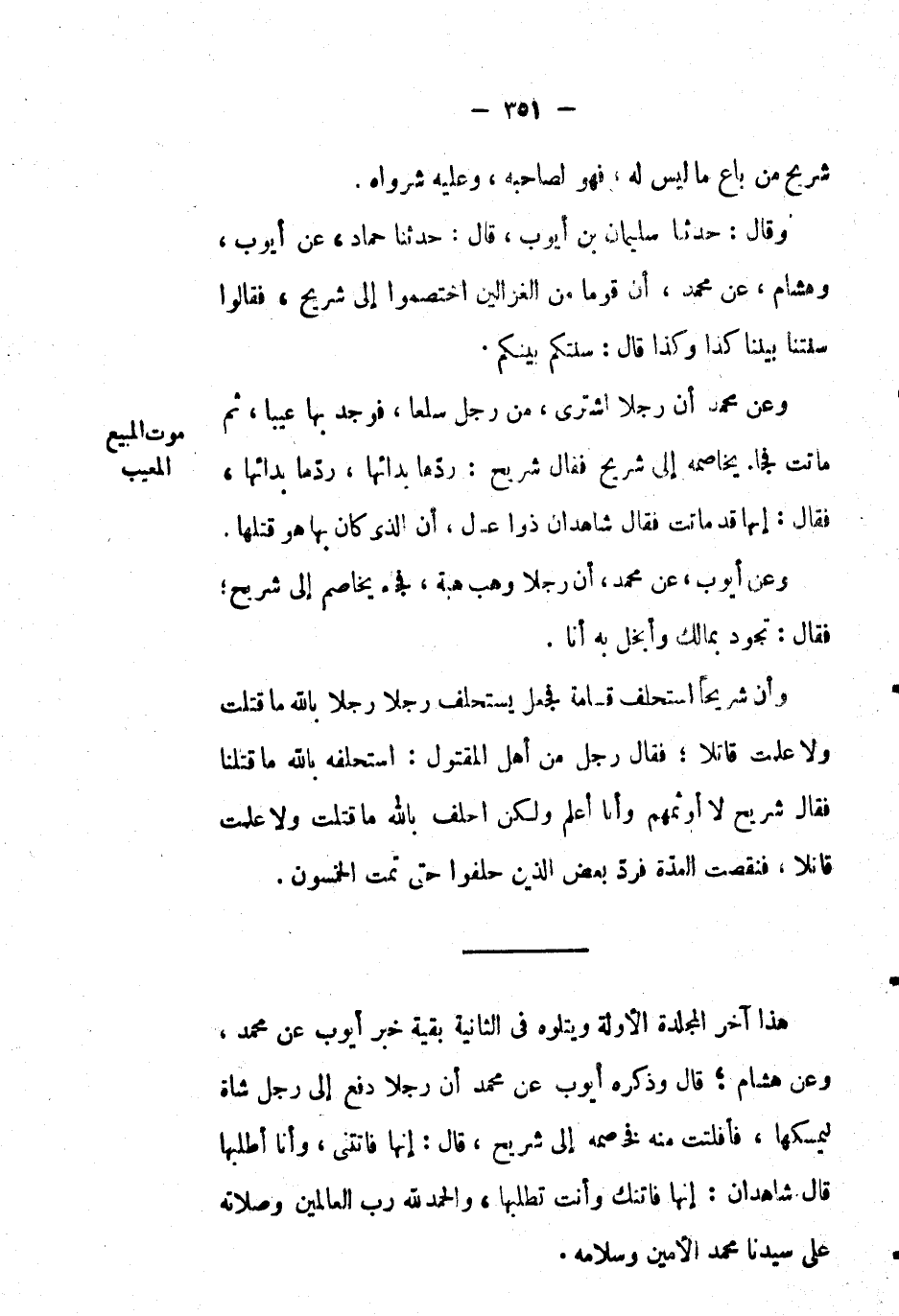 {هَذَا آخر المجلدة الأولة ويتلوه في الثانية بقية خبر أيوب عَن مُحَمَّد، وعن هشام؛ قَالَ: وذكره أيوب عَن مُحَمَّد أن رجلاً دفع إِلَى رجل شاة ليمسكها، فأفلتت منه فخاصمه إِلَى شريح، قال: إنها فاتتني، وأنا أطلبها قَالَ: شاهدان: إنها فاتتك وأنت تطلبها، والحمد لله رب العالمين وصلاته على سيدنا مُحَمَّد الأمين وسلامه} .