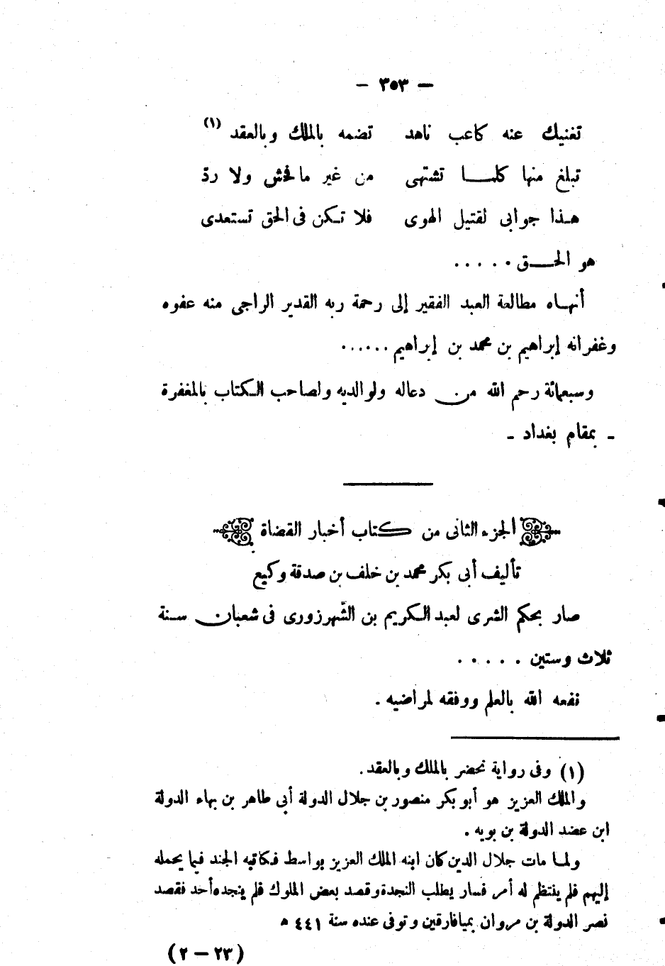 أنهاه مطالعة العَبْد الفقير إِلَى رحمة ربه القدير الراجي منه عفوه وغفرانه إبراهيم بْن مُحَمَّد بْن إبراهيم......وسبعمائة رحم الله من دعا له ولوالديه ولصاحب الكتاب بالمغفرة بمقام بغداد.