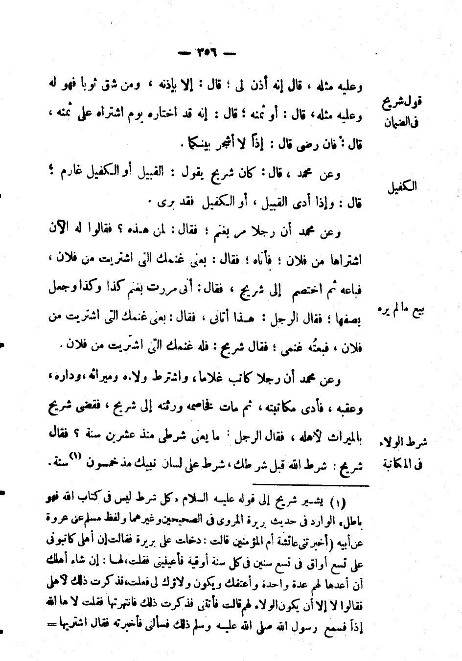 وعن مُحَمَّد أن رجلاً كاتب غلاماً، واشترط ولاءه وميراثه، وداره، وعقبه، فأدى مكاتبته، ثم مات فخاصمه ورثته إِلَى شريح، فقضى شريح بالميراث لأهله، فَقَالَ: الرجل: ما يعني شرطي منذ عشرين سنة ? فَقَالَ: شريح: شرط الله قبل شرطك، شرط على لسان نبيك مذ خمسون سنة.