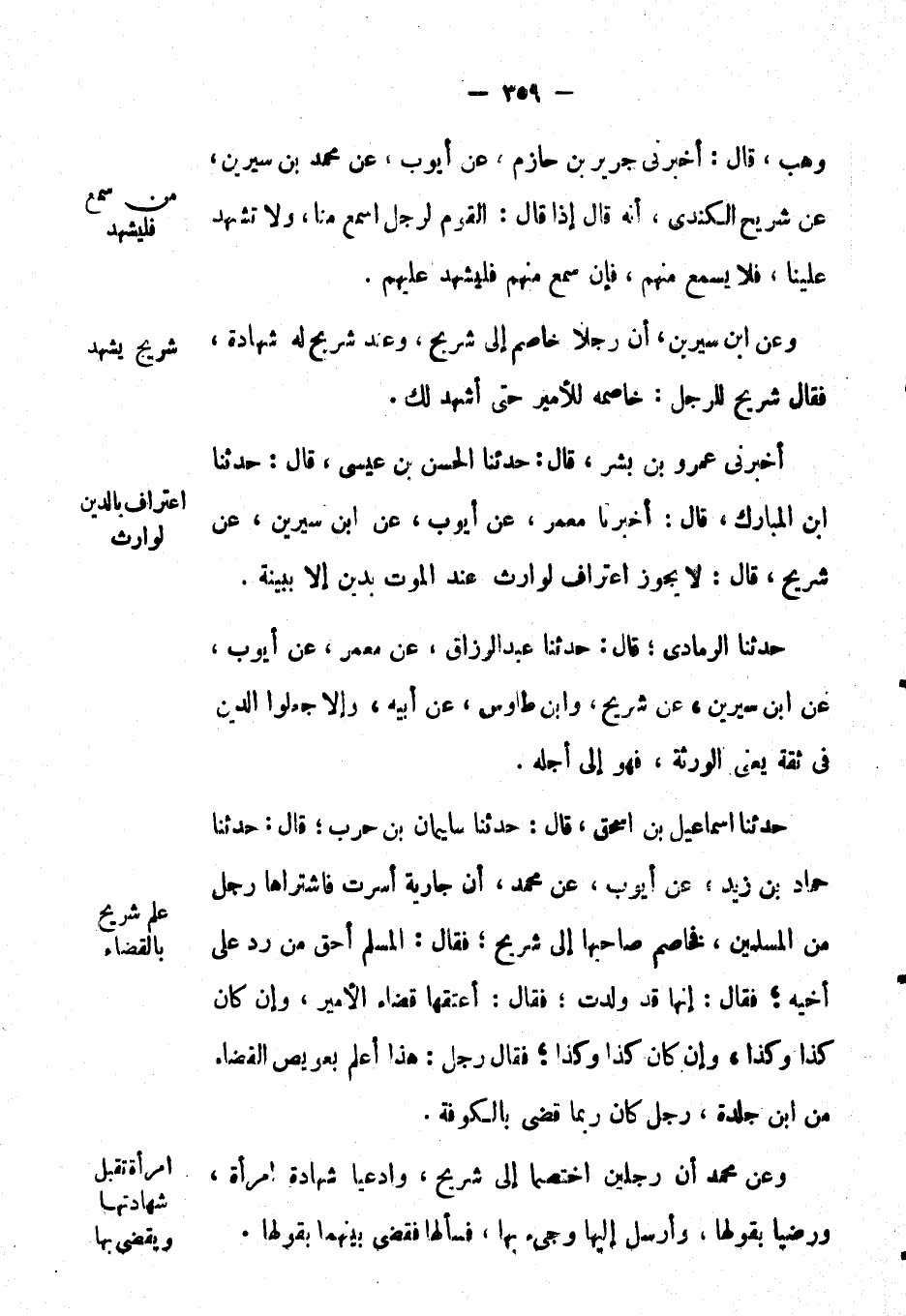 أَخْبَرَنِي عَمْرو بْن بشر، قال: حَدَّثَنَا الْحَسَن بْن عيسى، قال: حَدَّثَنَا ابن المبارك، قال: أَخْبَرَنَا مَعْمَر، عَن أيوب، عَن ابن سيرين، عَن شريح، قال: لا يجوز اعتراف لوارث عند الموت بدين إِلَّا ببينة.