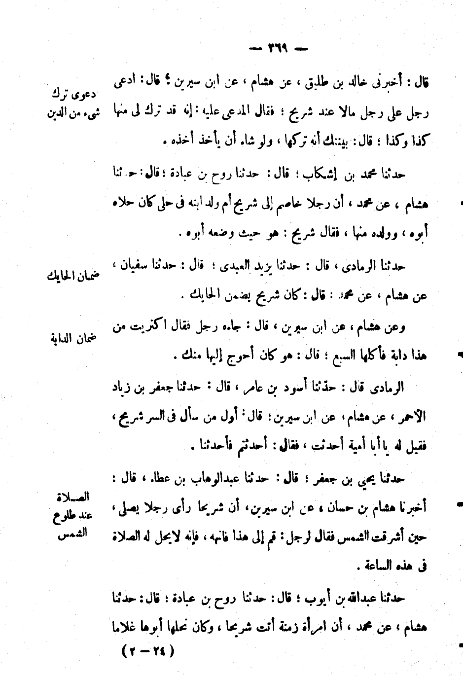 الرمادي قال: حَدَّثَنَا أسود بْن عامر، قال: حَدَّثَنَا جعفر بْن زِيَاد الأحمر، عَن هشام، عَن ابن سيرين؛ قال: أول من سأل في السر شريح، فقيل له يا أبا أمية أحدثت، فقال: أحدثتم فأحَدَّثَنَا.
