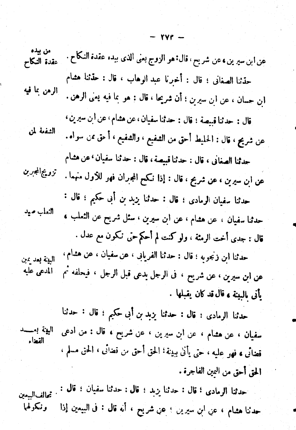 حَدَّثَنَا الرمادي: قال: حَدَّثَنَا يزيد بْن أبي حكيم؛ قال: حَدَّثَنَا سُفْيَان، عَن هشام، عَن ابن سيرين، عَن شريح، قال: من ادعى قضائي، فهو عليه، حتى يأتي ببينة؛ الحق أحق من قضائي، الحق مسلم، الحق أحق من اليمين الفاجرة.