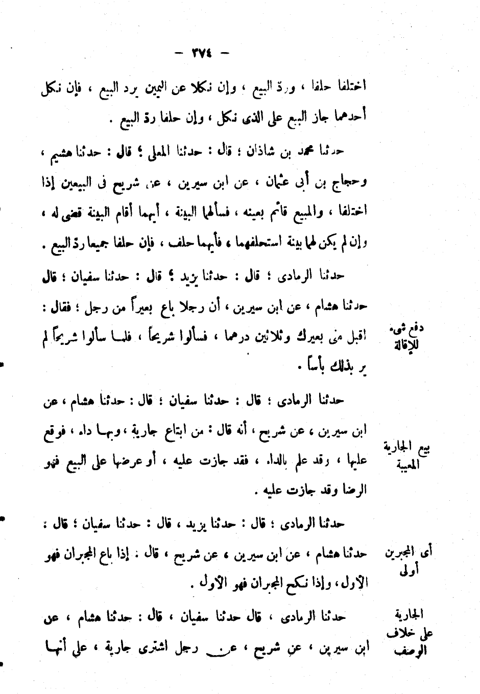 حَدَّثَنَا الرمادي؛ قال: حَدَّثَنَا يزيد؛ قال: حَدَّثَنَا سُفْيَان؛ قَالَ: حَدَّثَنَا هشام، عَن ابن سيرين، أن رجلاً باع بعيراً من رجل؛ فقال: اقبل مني بعيرك وثلاثين درهماً، فسألوا شريحاً، فلما سألوا شريحاً لم ير بذلك بأساً.
