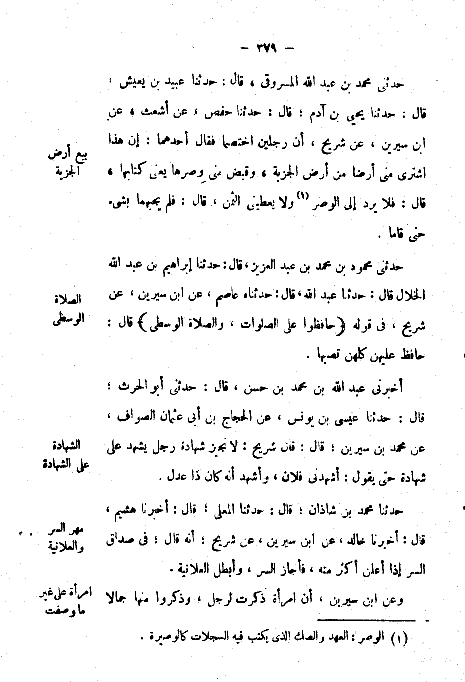 حَدَّثَنِي مُحَمَّد بْن عَبْد اللهِ المسروقي، قال: حَدَّثَنَا عبيد بْن يعيش، قال: حَدَّثَنَا يحيى بْن آدم؛ قال: حَدَّثَنَا حفص، عَن أشعث، عَن ابن سيرين، عَن شريح، أن رجلين اختصما فَقَالَ: أحدهما: إن هَذَا اشترى مني أرضاً من أرض الجزية، وقبض مني وصرها يعني كتابها، قال: فلا يرد إِلَى الوصر ولا يعطيني الثمن، قال: فلم يجبهما بشيء حتى قاما.