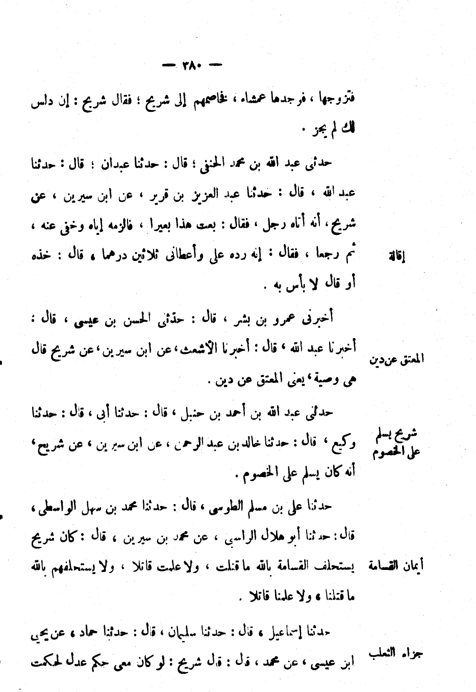 حَدَّثَنِي عَبْدُ اللهِ بْن أَحْمَد بْن حنبل، قال: حَدَّثَنَا أبي، قال: حَدَّثَنَا وكيع، قال: حَدَّثَنَا خالد بْن عَبْد الرحمن، عَن ابن سيرين، عَن شريح، أنه كان يسلم على الخصوم.