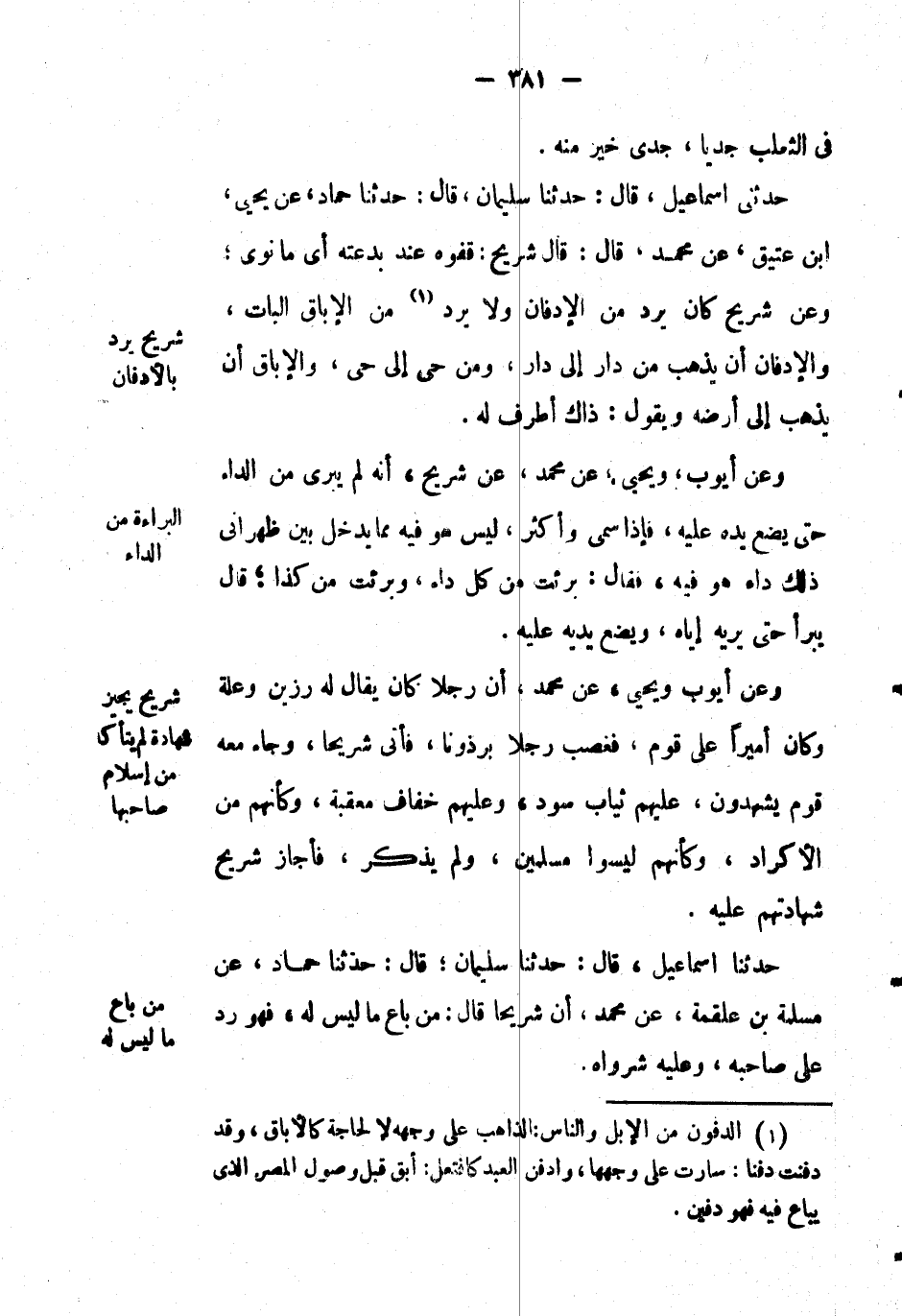 حَدَّثَنِي إسماعيل، قال: حَدَّثَنَا سليمان، قال: حَدَّثَنَا حماد، عَن يحيى، ابن عتيق، عَن مُحَمَّد، قال: قَالَ: شريح: قفره عند بدعته أي ما نوى؛ وعن شريح كان يرد من الإدفان ولا يرد من الإباق البات، والإدفان أن يذهب من دار إِلَى دار، ومن حي إِلَى حي، والإباق أن يذهب إِلَى أرضه ويقول: ذاك أطرف له.