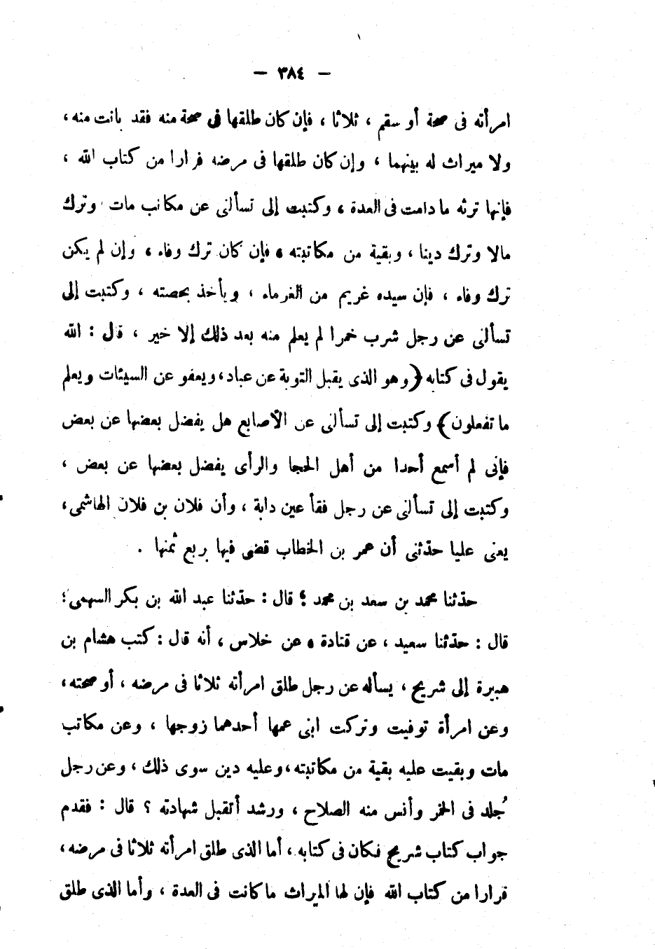 حَدَّثَنَا مُحَمَّد بْن سعد بْن مُحَمَّد؛ قال: حَدَّثَنَا عَبْدُ اللهِ بْن بكر السمي؛ قال: حَدَّثَنَا سعيد، عَن قتادة، عَن خرس، أنه قال: كتب هشام بْن هبيرة إِلَى شريح، يسأله عَن رجل طلق امرأته ثلاثاً في مرضه، أو صحته؛