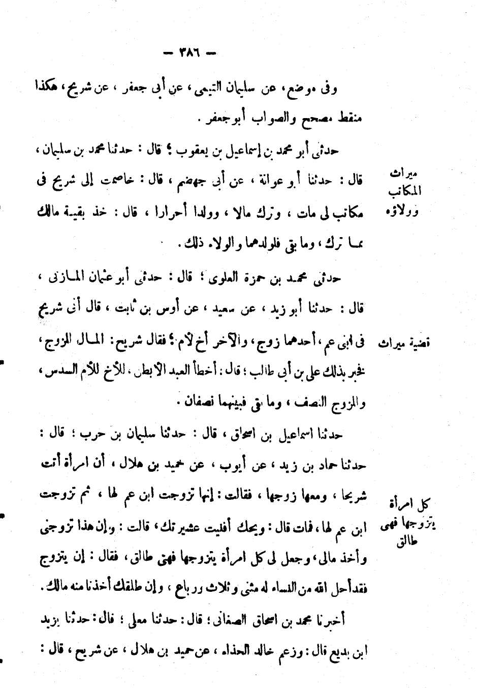 حَدَّثَنَا إسماعيل بْن إسحاق، قال: حَدَّثَنَا سليمان بْن حرب؛ قال: حَدَّثَنَا حماد بْن زيد، عَن أيوب، عَن حميد بْن هلال، أن امرأة أتت شريحاً، ومعها زوجها، فقالت: إنها تزوجت ابن عم لها، ثم تزوجت ابن عم لها، فمات قال: ويحك أفنيت عشيرتك، قالت: وإن هَذَا تزوجني وأخذ مالي، وجعل لي كل امرأة يتزوجها فهي طالق، فقال: إن يتزوج فقد أحل الله من النِّسَاء له مثنى وثلاث ورباع، وإن طلقك أخذنا منه مالك.